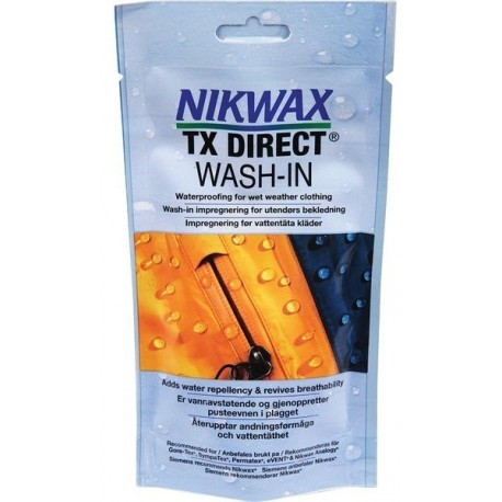 Apģērba impregnēšanas līdzeklis NIKWAX "TX.Direct Wash-In". Piešķir ūdensnecaurlaidību (hidrofobās īpašības) un atjauno elpojošās īpašības. Ērti lietojams, ūdens bāzes līdzeklis elpojoša apģērba, kurš nesatur mitrumuzsūcošus slāņus, ūdensnecaurlaidības īpašību atjaunošanai un uzlabošanai (impregnēšanai). Ieteicams Gore-Tex®, SympaTex®, Permatex® un Nikwax® Analogy® apģērbam. Labāka rezultāta sasniegšanai noņemiet visas nemazgājamās daļas un apstrādājamo apģērbu izmazgājiet ar līdzekli Nikwax® Tech Wash® atsevišķā mazgāšanas ciklā. Apģērbu pirms impregnēšanas nežāvēt. Sekojiet kopšanas instrukcijai uz izstrādājuma etiķetes. Pirms lietošanas sakratīt.