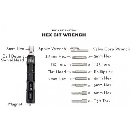 EnCase System Bar Kit One komplekā ietilpst Hex Bit Wrench Multi-tool, Chain + Tire Plug Multi-tool un divas uzglabāšanas uzmavas.