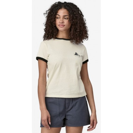 Sieviešu retro stila t-krekls no Patagonia. Ražots no pārstrādātiem materiāliem, kas iegūti no auduma atgriezumiem un pārstrādātām pudelēm, samazinot ietekmi uz dabu. Apdrukāts ar grafiku no Patagonia pirmsākumiem.