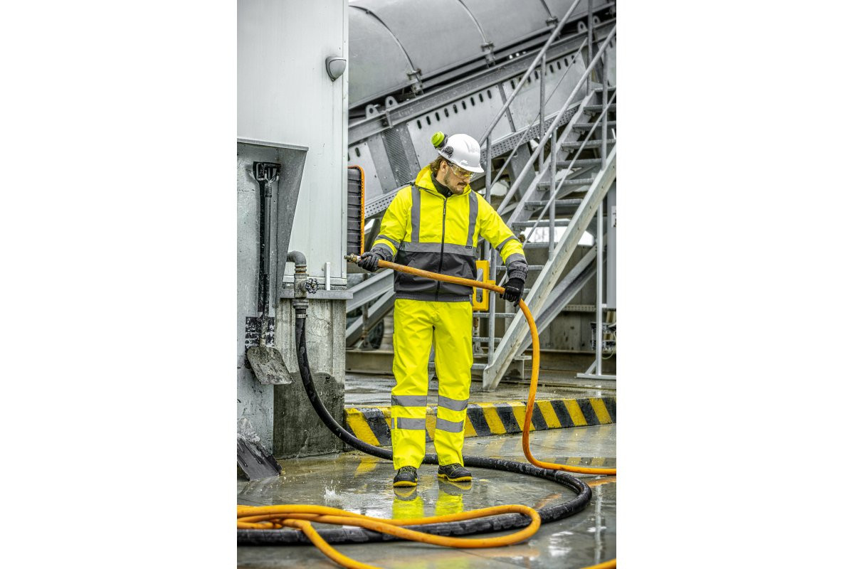Vīriešu augstas redzamības lietus kombinezons, izgatavots no augstākās kvalitātes materiāliem. Tas izceļas ar vieglumu un gaisa caurlaidību, nodrošinot maksimālu valkāšanas komfortu. Kombinezons pasargā no lietus (ūdensizturība 2000 mm H₂O) un vēja. Tas palielina drošību samazinātas redzamības apstākļos, piemēram, naktī vai sliktos laika apstākļos, piemēram, lietus vai miglas laikā. Dzeltenā krāsa ir paredzēta nozarēm, kur darbiniekiem jābūt redzamiem, piemēram, ceļu būvētājiem, ostu darbiniekiem, naftas platformu strādniekiem, kā arī kalnrūpniecības un glābšanas dienestu darbiniekiem kalnos.