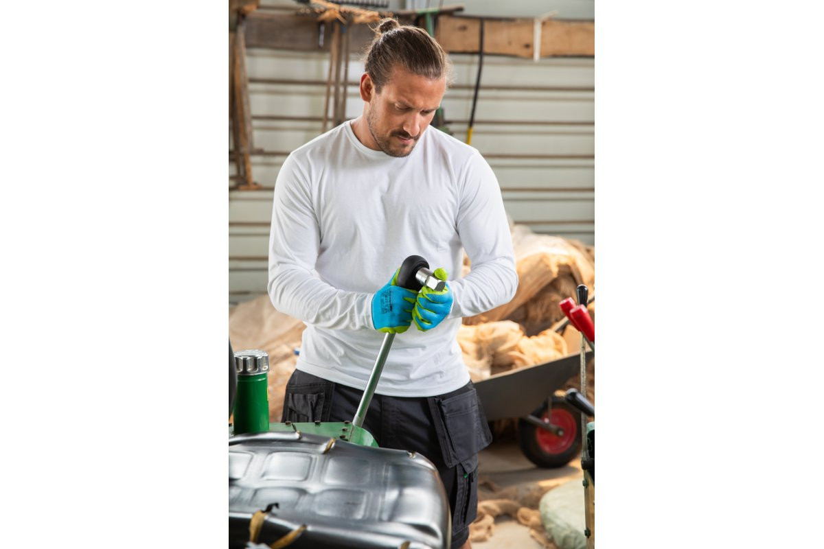 ULLER cimdi, pārklāti ar gofrētu lateksu, nodrošina izcilu aizsardzību pret mehāniskiem riskiem, vienlaikus piedāvājot augstu komforta līmeni. To zilo un zaļo krāsu kombinācija piešķir stilīgu izskatu, bet 13 adījuma poliestera audums nodrošina elastību un izturību. Tie ir ideāli piemēroti, lai aizsargātu rokas dažādās aktivitātēs, tostarp mājas darbos un precizitātes uzdevumos.