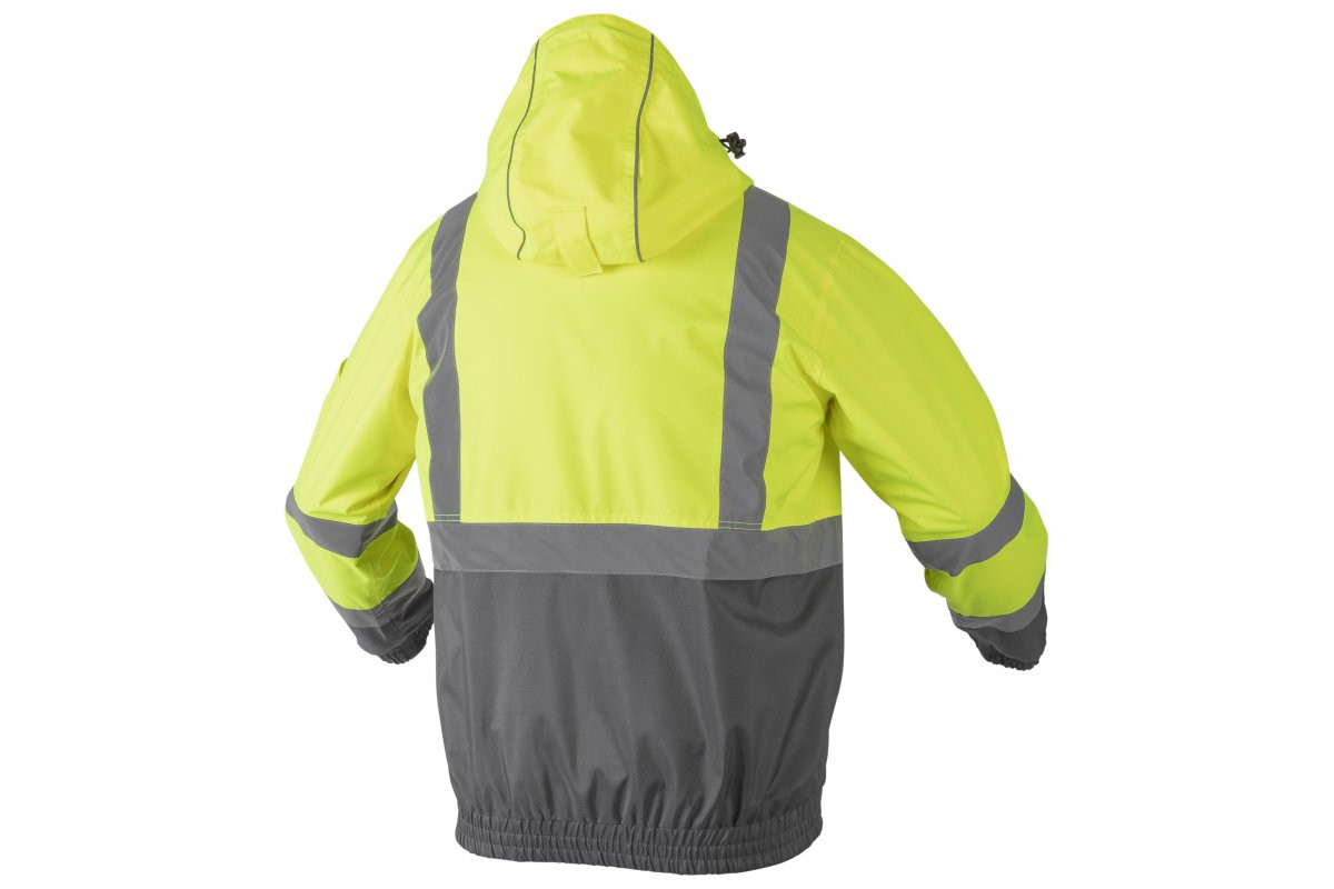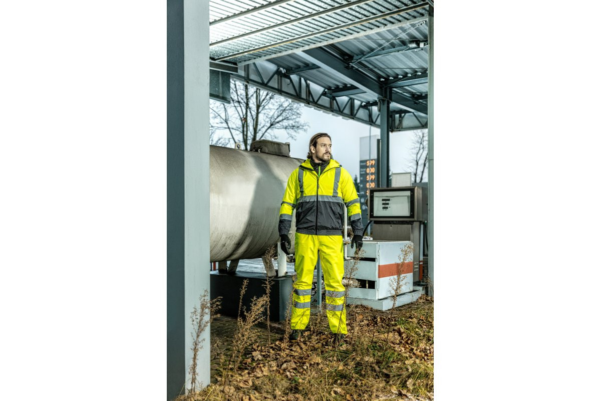 Moderns augstas redzamības vasaras bomber jakas modelis bez izolācijas. Tā ir viegla un elpojoša, nodrošinot maksimālu valkāšanas komfortu. Jakas aizsargā pret lietu (ūdensizturība 2000 mm H₂O) un vēju. Tā palielina drošību samazinātas redzamības apstākļos, piemēram, pārvietojoties naktī vai sliktos laika apstākļos, piemēram, lietus vai miglas laikā. Produkts ir paredzēts nozarēm, kur darbiniekiem jābūt redzamiem, piemēram, ceļu būvētājiem, ostu darbiniekiem, naftas platformu strādniekiem, kalnrūpniecības darbiniekiem, lidostu darbiniekiem vai kalnu glābšanas dienestiem.