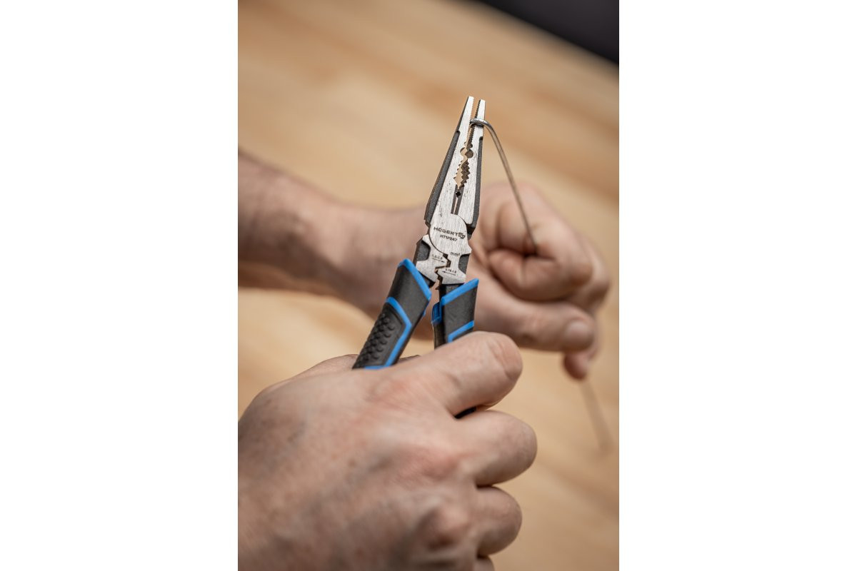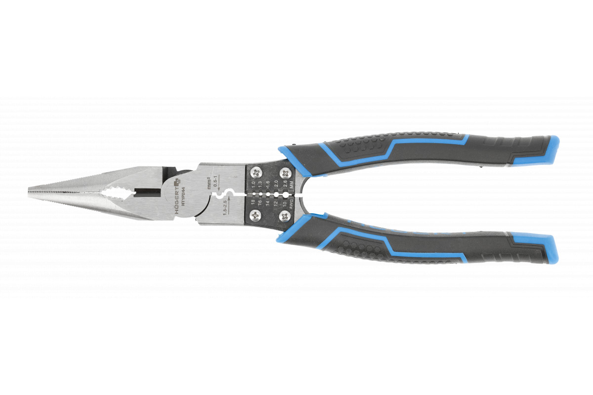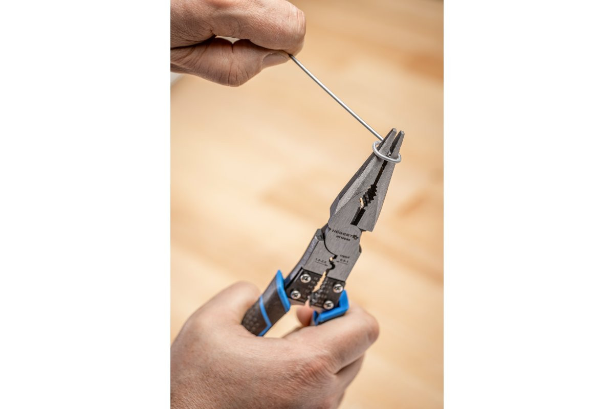 HT1P244 Universālie daudzfunkcionālie knaibles apvieno 9 funkcijas, ļaujot ērti un ātri veikt dažādus uzdevumus. Šis rīks ietaupa vietu, kas būtu nepieciešama vairākiem dažādiem instrumentiem, un samazina instrumentu somas svaru. Šaurais knaibļu gals ļauj turēt mīkstus materiālus un objektus ar diametru līdz 50 mm, kā arī saspiežot, griežot, velkot un satverot šaurās vietās. Papildus tam apaļā forma ļauj veidot vadu cilpas. Knaibļu augšējā virsma ir aprīkota ar failu, kas nodrošina deburring un nelielu nevienmērību noņemšanu. Preses rīks nodrošina pastāvīgu apstrādi 0.5-1.0 un 1.5-2.5 mm² elektrisko kabeļu galu uzmavām. Pateicoties precīzi grieztām asmeņiem, elektrisko vadu izolācijas noņēmējs nesabojā kodolu no 1 līdz 2.6 mm. Augstas kvalitātes, vienmērīgi cietināts hroma-vanādija tērauds nodrošina intensīvu knaibļu izmantošanu smagiem darbiem, kas prasa augstu spiedienu. Modernā indukcijas siltuma apstrādes tehnoloģija nodrošina rīka augstu cietību, kas novērš asmeņu noslīdēšanu. Labi pārdomātā ģeometrija atvieglo griešanu. Smalki slīpētas, cietas darba virsmas un zobi nodrošina precīzu darbu. Ergonomiskās roktura apvalki, izgatavoti no bojājumiem izturīga un mīksta TPU materiāla, nodrošina lielisku komfortu ilgstošas darba laikā. Raksturojums: izolācijas noņemšanas diapazons AWG – 10 / 12 / 14 / 16 / 18; izolācijas noņemšanas diapazons – 1 / 1.3 / 1.6 / 2 / 2.6 mm; elektrisko termināļu saspiešanas diapazons – 0.5-1.0 / 1.5-2.5 mm²; žokļa cietība – 43-48 HRC; asmeņu cietība – 58-63 HRC; knaibļu materiāls – CRV 60 tērauds; roktura apvalka materiāls – TPE; garums – 230 mm; platums – 51 mm; funkcijas: 1. turēšana, 2. saspiešana, 3. griešana, 4. satveršana, 5. locīšana, 6. izolācijas noņemšana, 7. termināļu savienošana, 8. pievilkšana, 9. slīpēšana. Rokturis: TPE