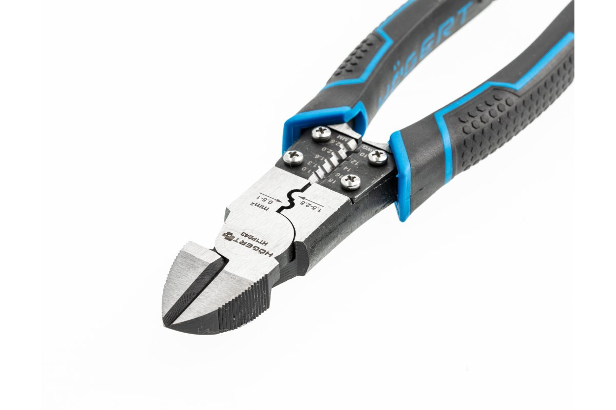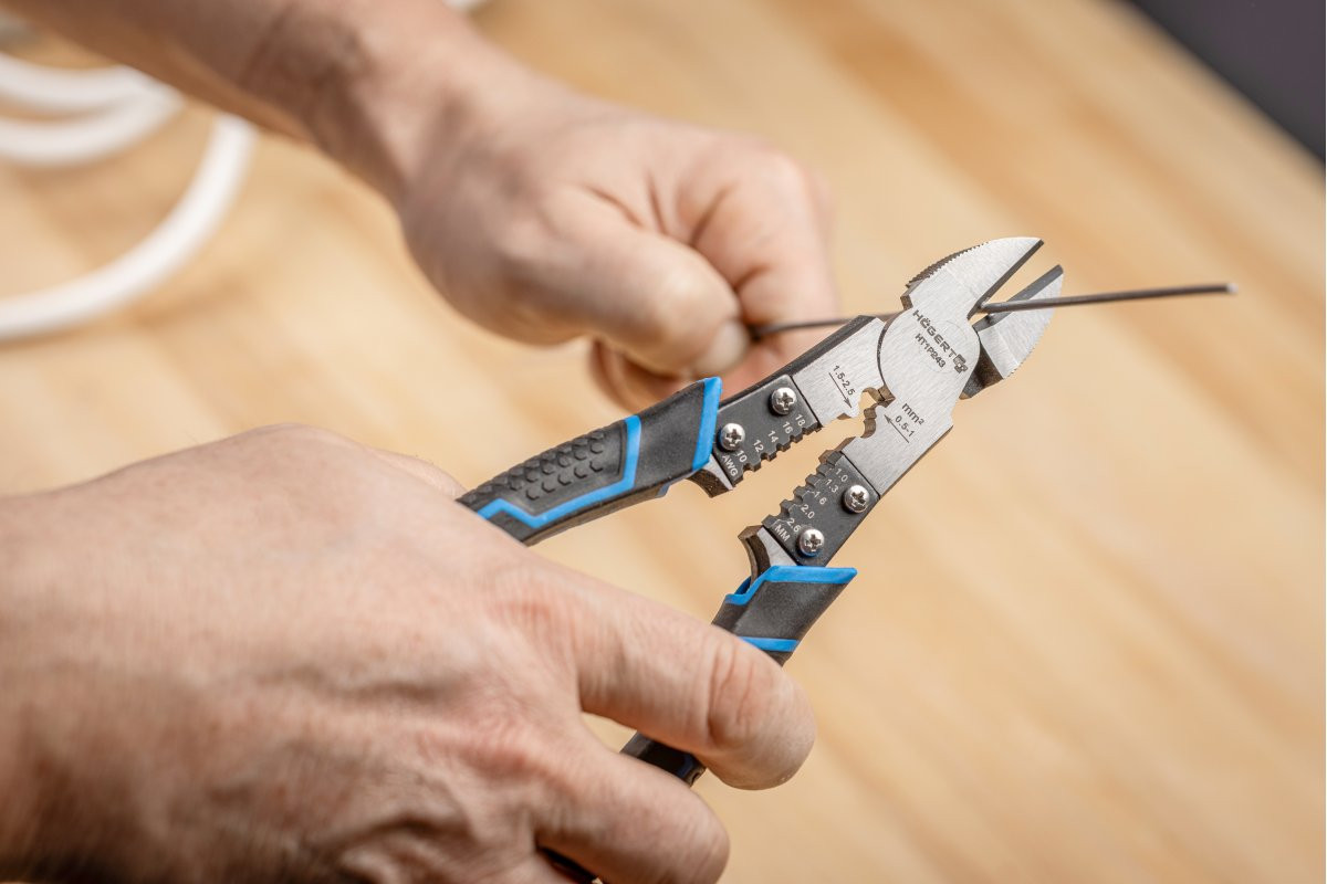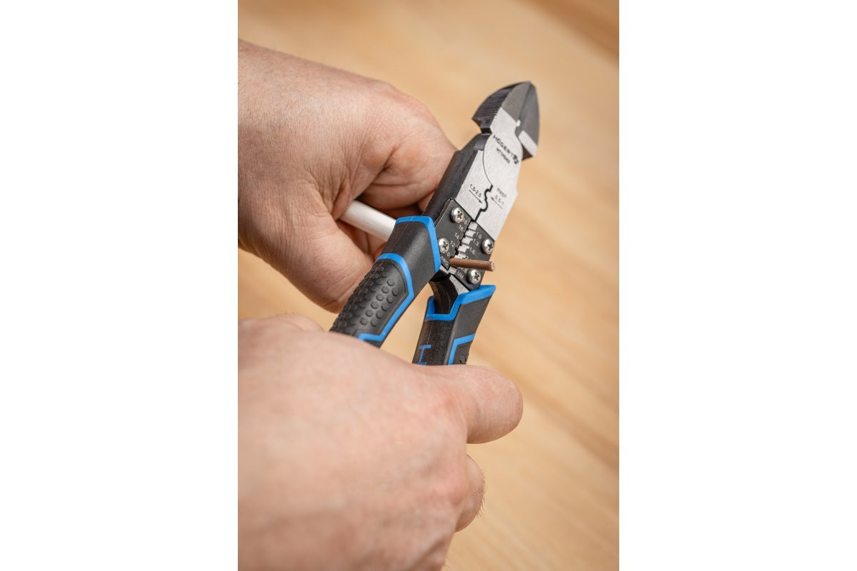 Universālais 6 in 1 rīks apvieno daudzas funkcijas, ļaujot ērti un ātri veikt dažādus uzdevumus. Šis rīks palīdz ietaupīt vietu, kas būtu nepieciešama vairākiem dažādiem instrumentiem, un samazina instrumentu somas svaru. Asais un cietais griezējs spēj pārgriezt cietu vadu ar diametru līdz 17 mm. Griezēja augšējā virsma ir aprīkota ar failu, kas ļauj noņemt burrs un nelielas neregularitātes. Preses rīks nodrošina pastāvīgu apstrādi 0.5-1.0 un 1.5-2.5 mm² elektrisko kabeļu galu uzmavām. Pateicoties precīzi grieztiem asmeņiem, elektriskā vadu izolācijas noņēmējs nesabojā kodolu no 1 līdz 2.6 mm. Augstas kvalitātes, vienmērīgi cietināts hroma-vanādija tērauds nodrošina intensīvu knaibu izmantošanu smagiem darbiem, kas prasa augstu spiedienu. Modernā indukcijas siltuma apstrādes tehnoloģija nodrošina rīka augstu cietību, kas novērš asmeņu noslīdēšanu. Rūpīgi izstrādātā ģeometrija atvieglo griešanu. Smalki slīpētas, cietas darba virsmas un zobi nodrošina precīzu darbu. Ergonomiskās roktura apvalki, izgatavoti no bojājumiem izturīga un mīksta TPU materiāla, nodrošina lielisku komfortu ilgstoša darba laikā. izolācijas noņemšanas diapazons AWG – 10 / 12 / 14 / 16 / 18;