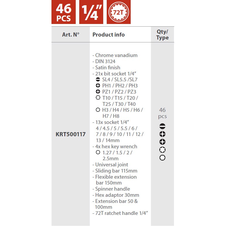 Instrumentu komplekts 1/4" (46gab.) KRT500117 KREATOR
