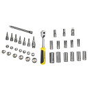 STANLEY® TRANSMODULE SYSTEM™ 3/8 collu uzgaļu modulis, 36 gab. modulārajā kastē ir saderīgs ar STANLEY® TRANSMODULE sistēmas uzglabāšanas skapjiem. Komplektā ietilpst bumbierveida galvas ratchets, kas izgatavoti no hroma vanādija tērauda ar divu materiālu rokturi un hroma vanādija uzgaļiem.