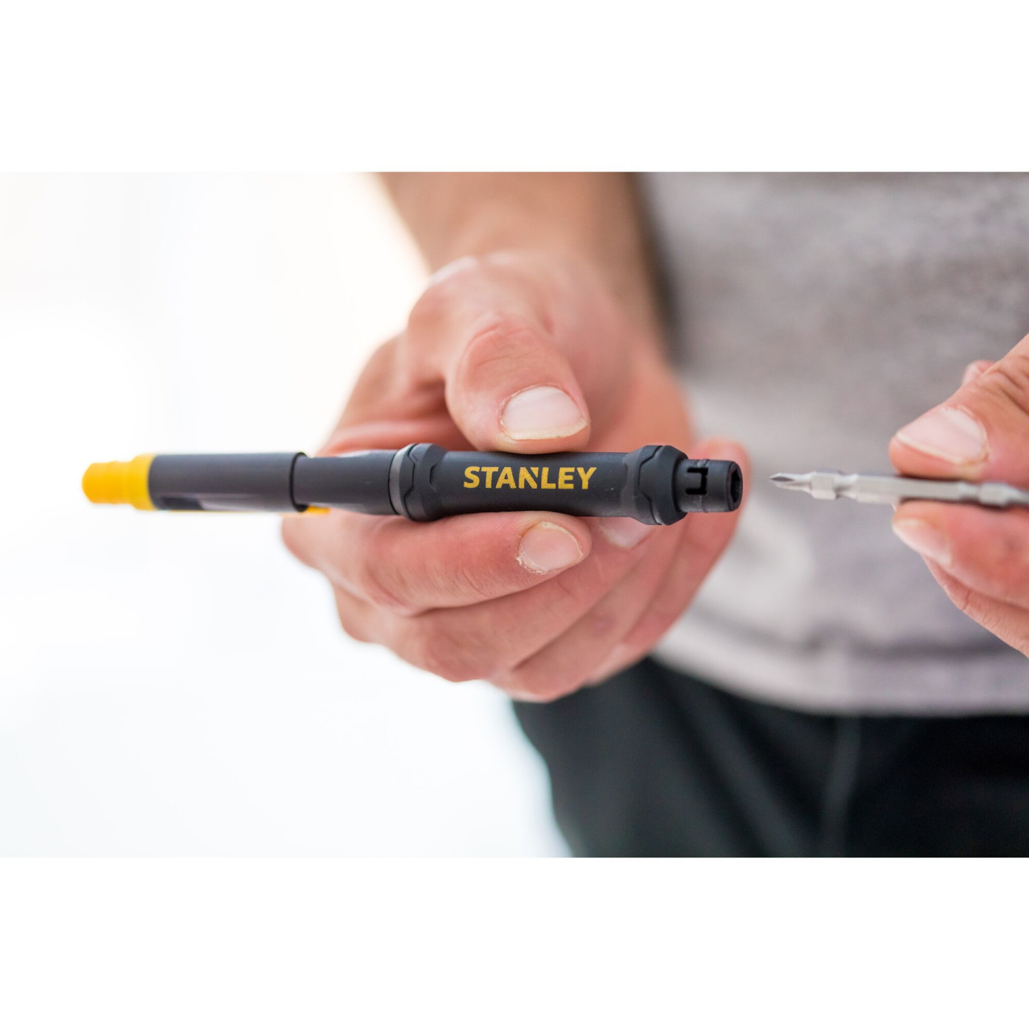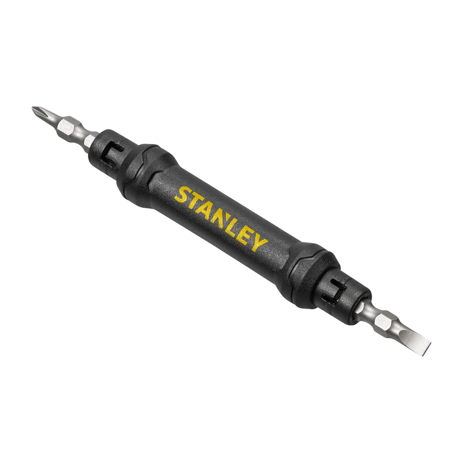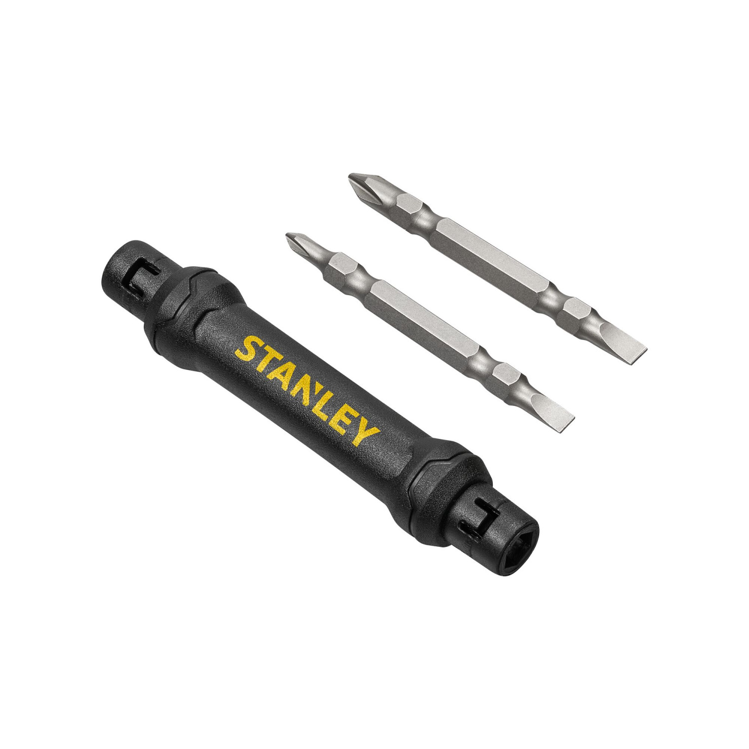 STANLEY® Skrūvgriežu kabatas vadītājs ir aprīkots ar diviem divgalu bitiem. Magnētiskie biti ar neslīdošu teksturētu virsmu pievelk un notur mazās skrūves, novēršot to slīdēšanu, plaisāšanu vai lobīšanos. Ekskluzīvā S2 instrumentu tērauda cietināšana nodrošina maksimālu izturību. Mīkstā divmateriālu roktura konstrukcija nodrošina papildu komfortu un kontroli. Cinka asmens slīdnis garantē izturību un spēku.