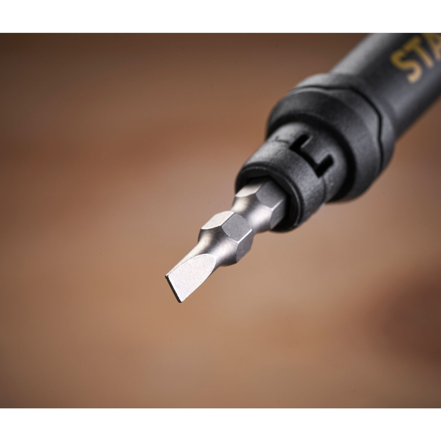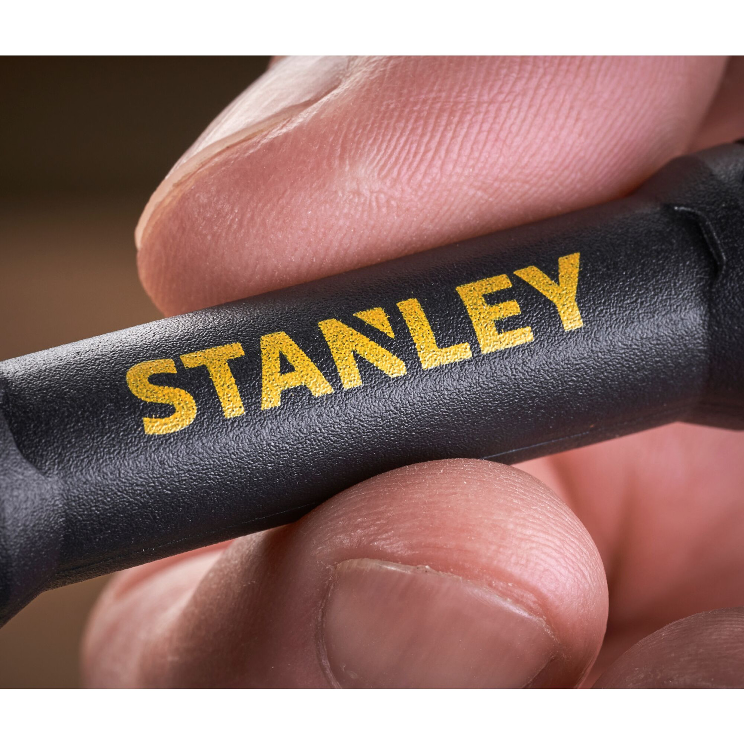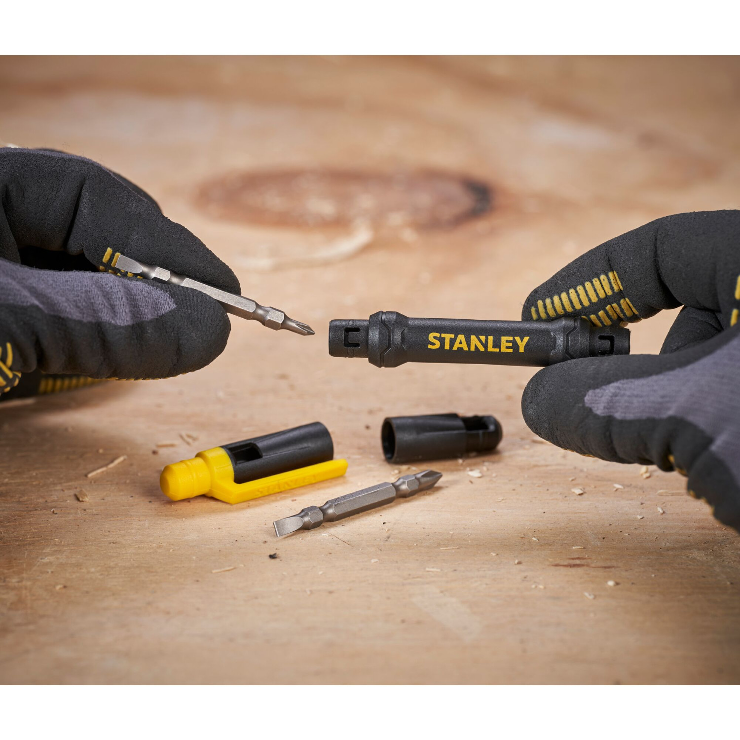 STANLEY® Skrūvgriežu kabatas vadītājs ir aprīkots ar diviem divgalu bitiem. Magnētiskie biti ar neslīdošu teksturētu virsmu pievelk un notur mazās skrūves, novēršot to slīdēšanu, plaisāšanu vai lobīšanos. Ekskluzīvā S2 instrumentu tērauda cietināšana nodrošina maksimālu izturību. Mīkstā divmateriālu roktura konstrukcija nodrošina papildu komfortu un kontroli. Cinka asmens slīdnis garantē izturību un spēku.