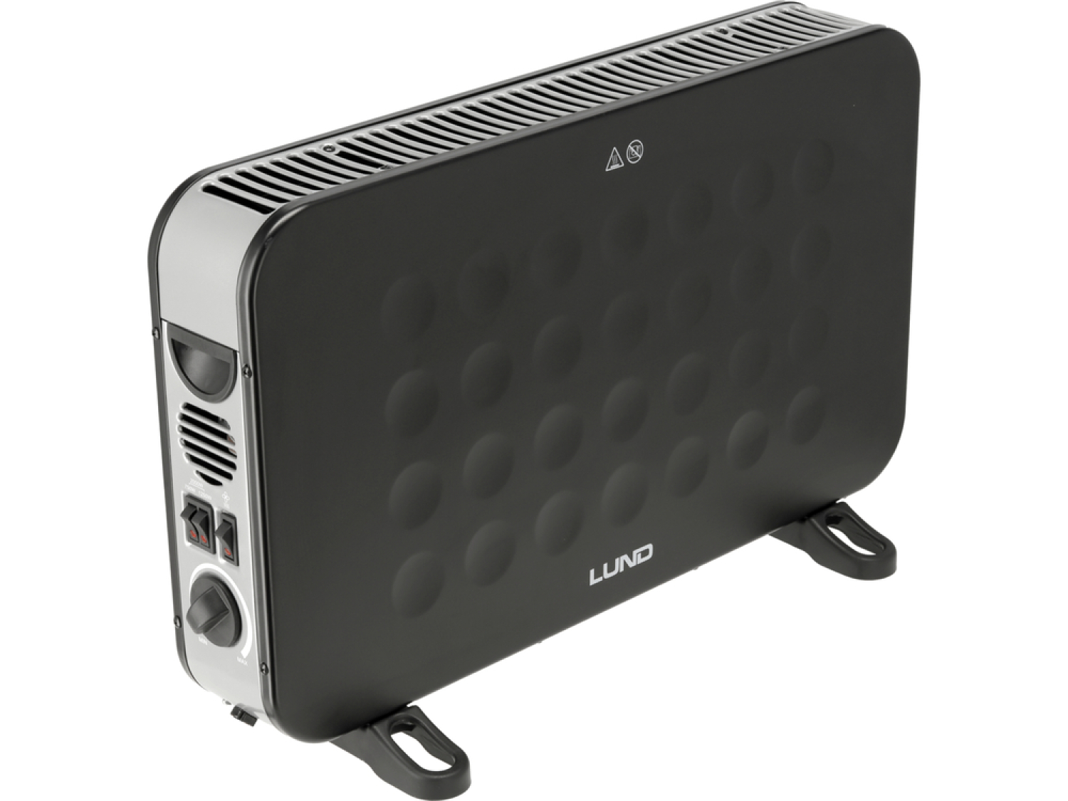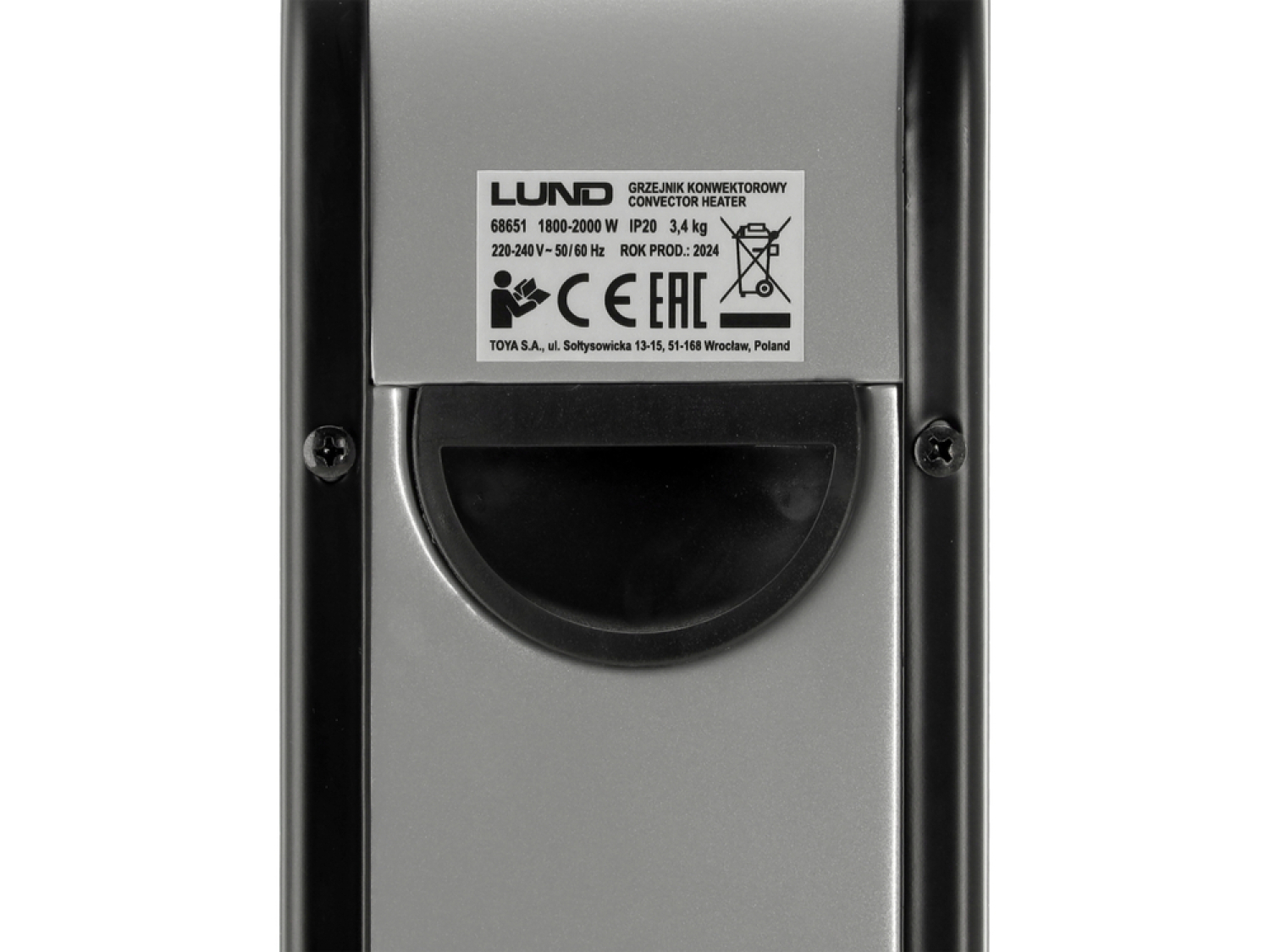 LUND 68651 ir melns konvektora sildītājs ar 2000 W jaudu un 3 jaudas līmeņiem (750 W / 1250 W / 2000 W). Tas aprīkots ar mehānisko vadību, LED indikatoru, drošības aizsardzību pret pārkaršanu, kā arī rokturiem ērtai pārvietošanai un stabilām kājām. Paredzēts lietošanai sausās iekštelpās.