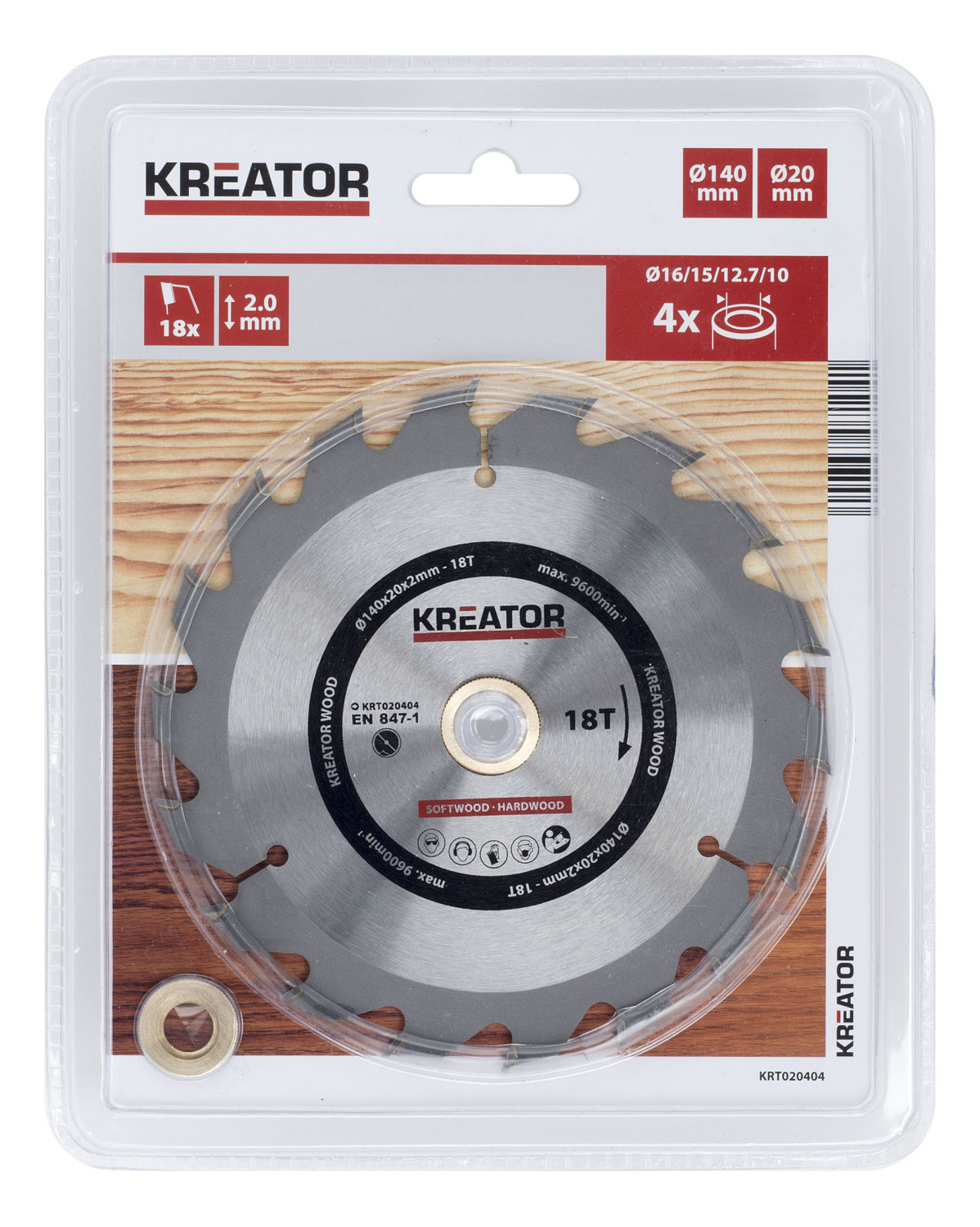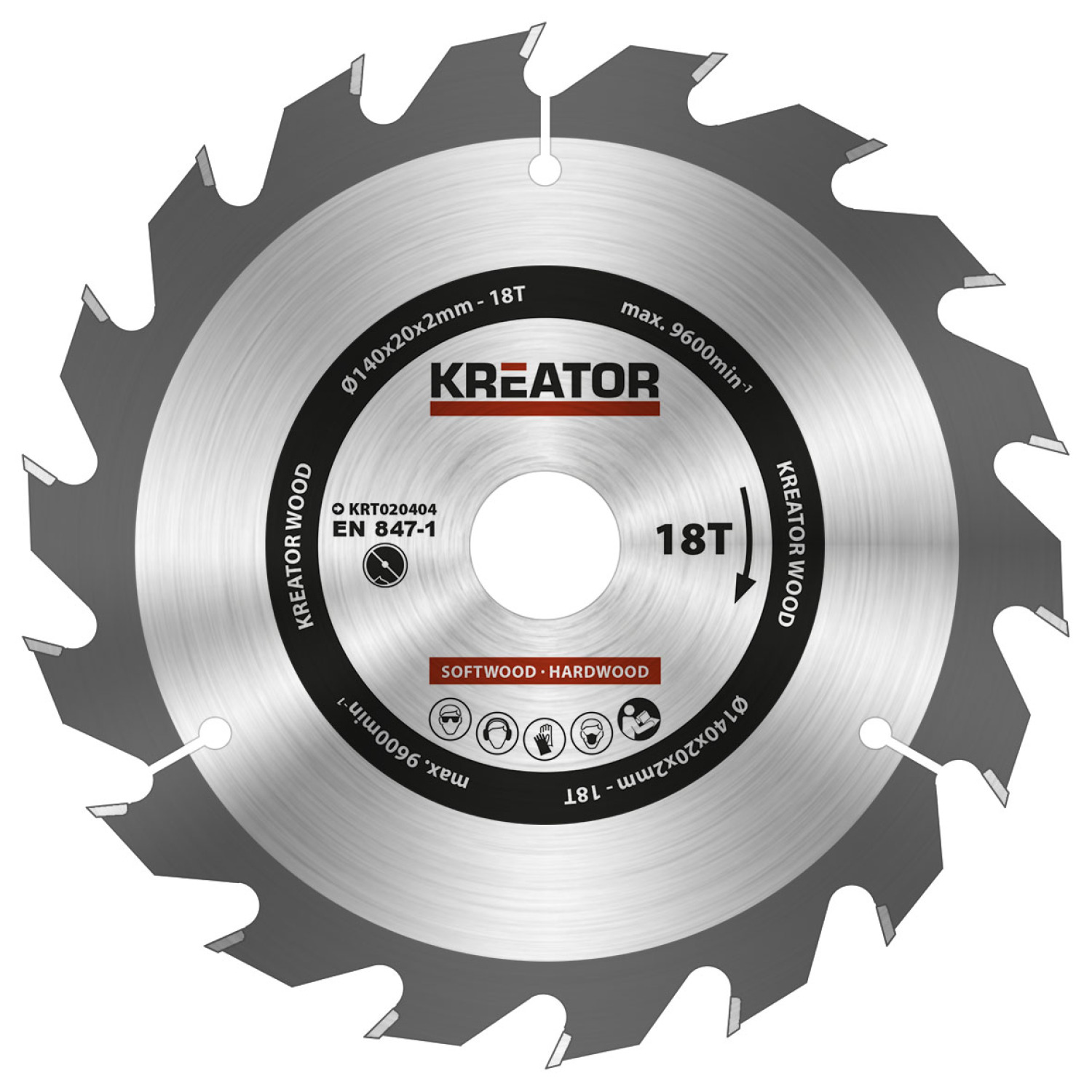 Zāģripa Ø 140x20x2,0mm 18T, KREATOR, KRT020404, Urbumu izmērs: 20 mm, Diska diametrs: 140 mm, Kopējais zobu skaits: 18, Zobu leņķis: 20 °, Griezuma platums: 2.00 mm, Asmens biezums: 1.30 mm