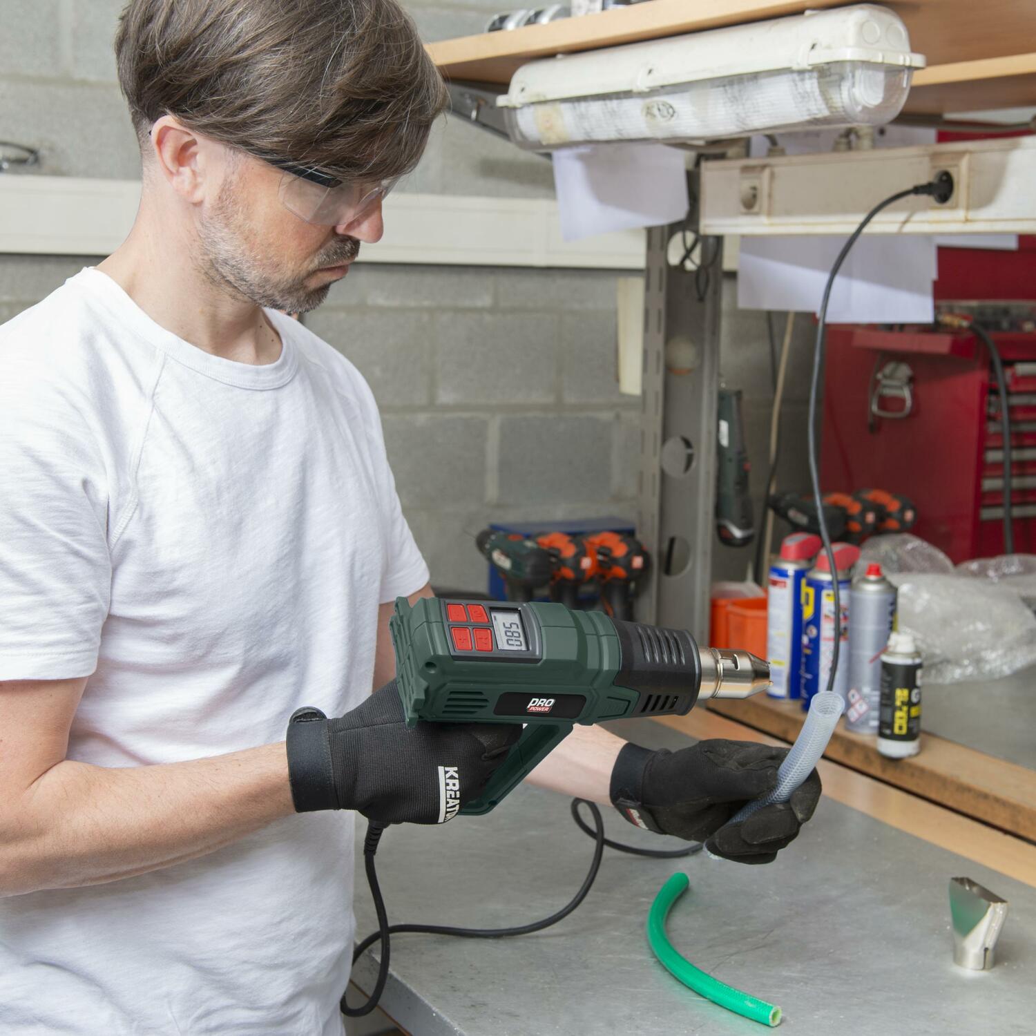 Izvēlieties starp 3 temperatūras iestatījumiem, lai optimizētu temperatūru konkrētām vajadzībām. Izmantojiet zemāko iestatījumu ar minimālo 50 °C, lai ātri izžāvētu mitru koku vai krāsu, noņemtu uzlīmes, atlaidinātu sasalušas caurules vai izmantotu slēpju vaskošanai. Augstākais iestatījums sasniedz līdz 600 °C un to var izmantot plastmasas cauruļu locīšanai, uzgriežņu un skrūvju atvieglošanai, kā arī krāsas vieglai noņemšanai.