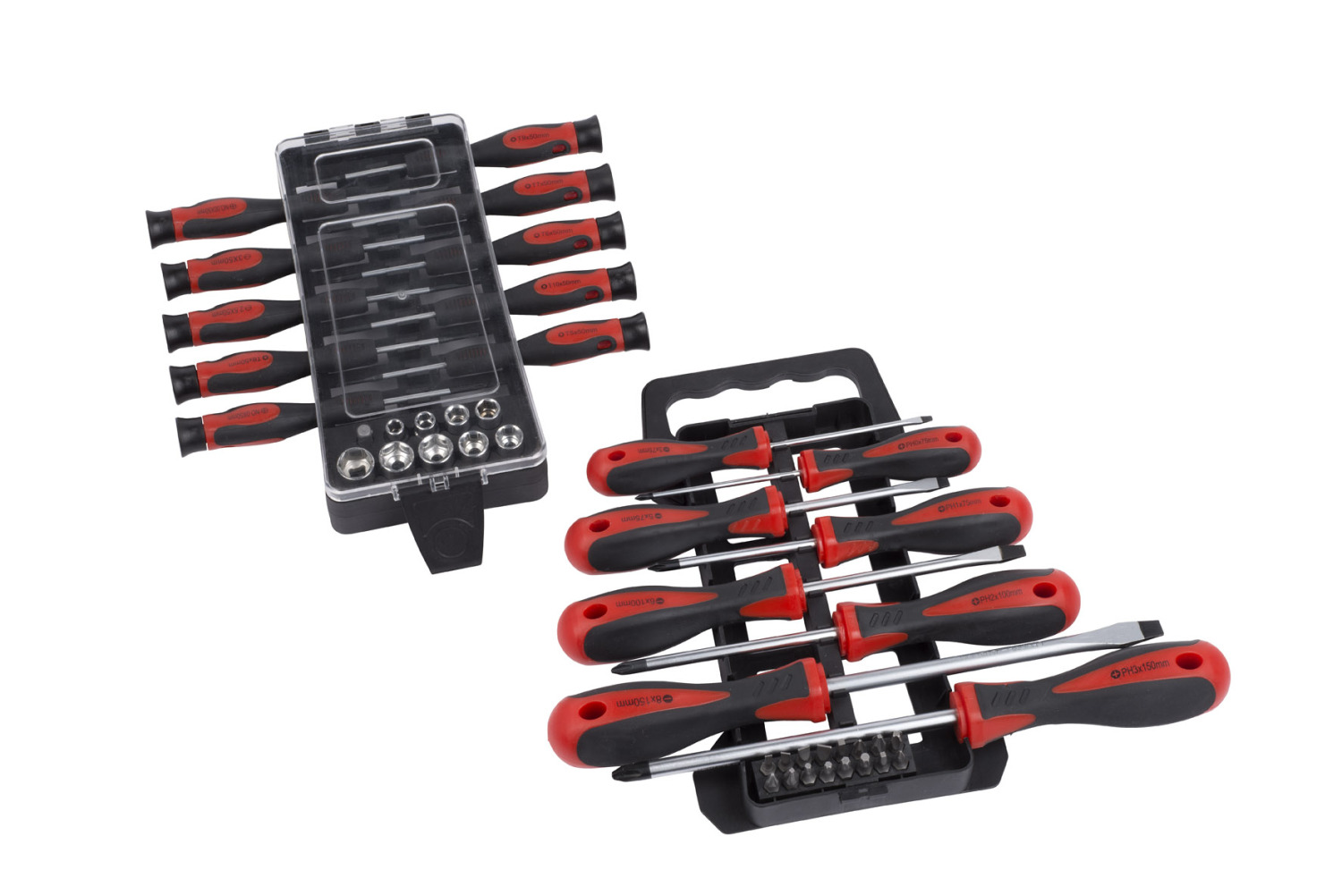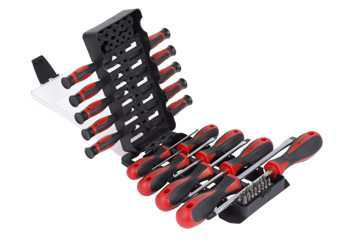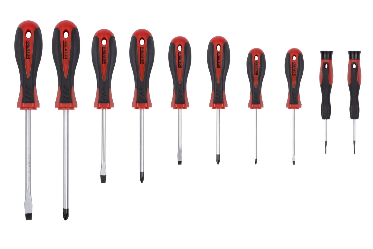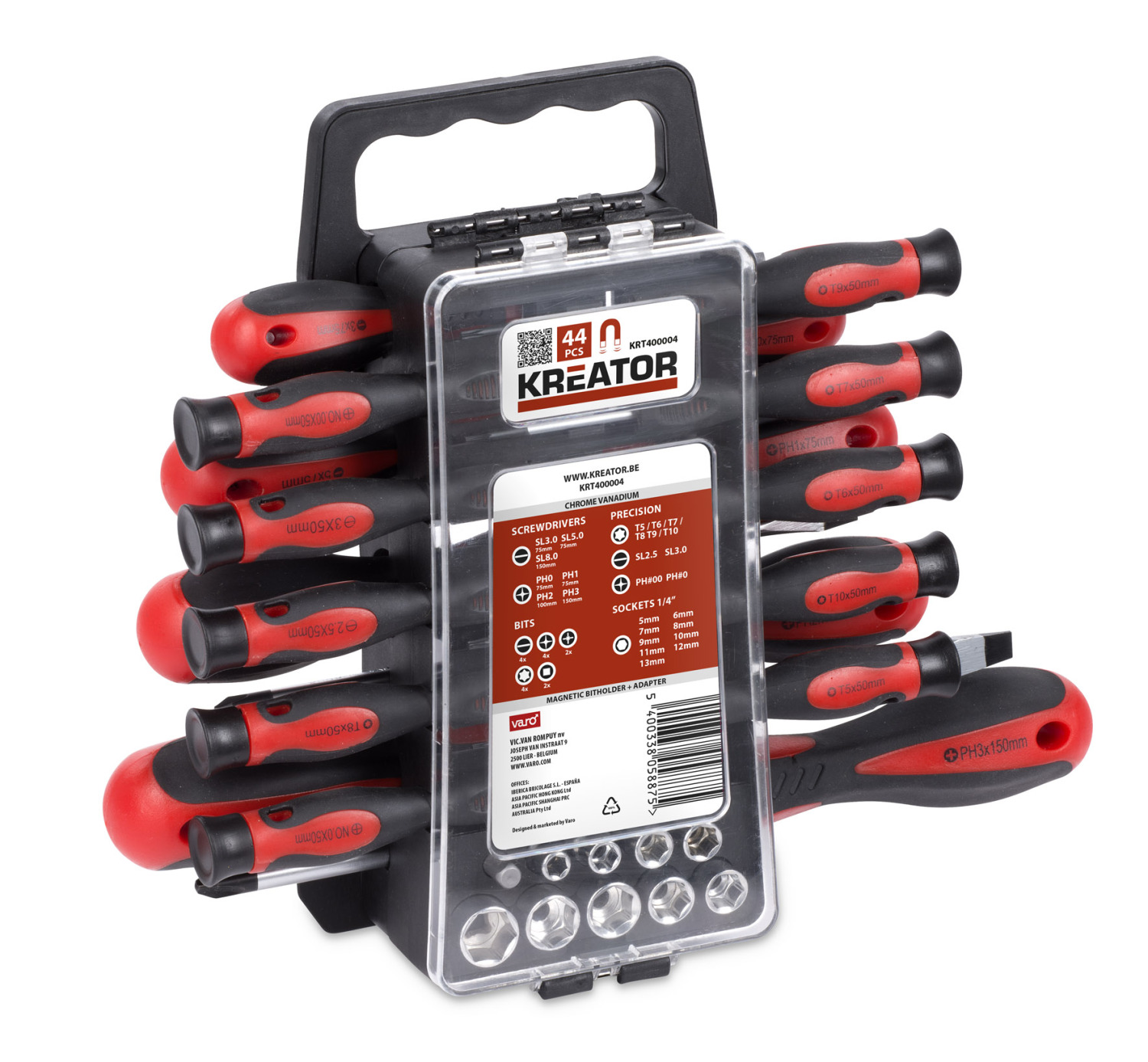 Skrūvgriežu komplekts 44 gab. no KREATOR, KRT400004, ir lieliska izvēle ikvienam, kurš vēlas risināt projektus saistībā ar skrūvēm. Hroma vanādija skrūvgrieži ir ērti uzglabāti praktiskā kastē, kuru var piekārt pie sienas. Katram skrūvgriezim ir magnētiskais uzgalis un ergonomisks rokturis, kas nodrošina vieglu un komfortablu skrūvju montāžu.