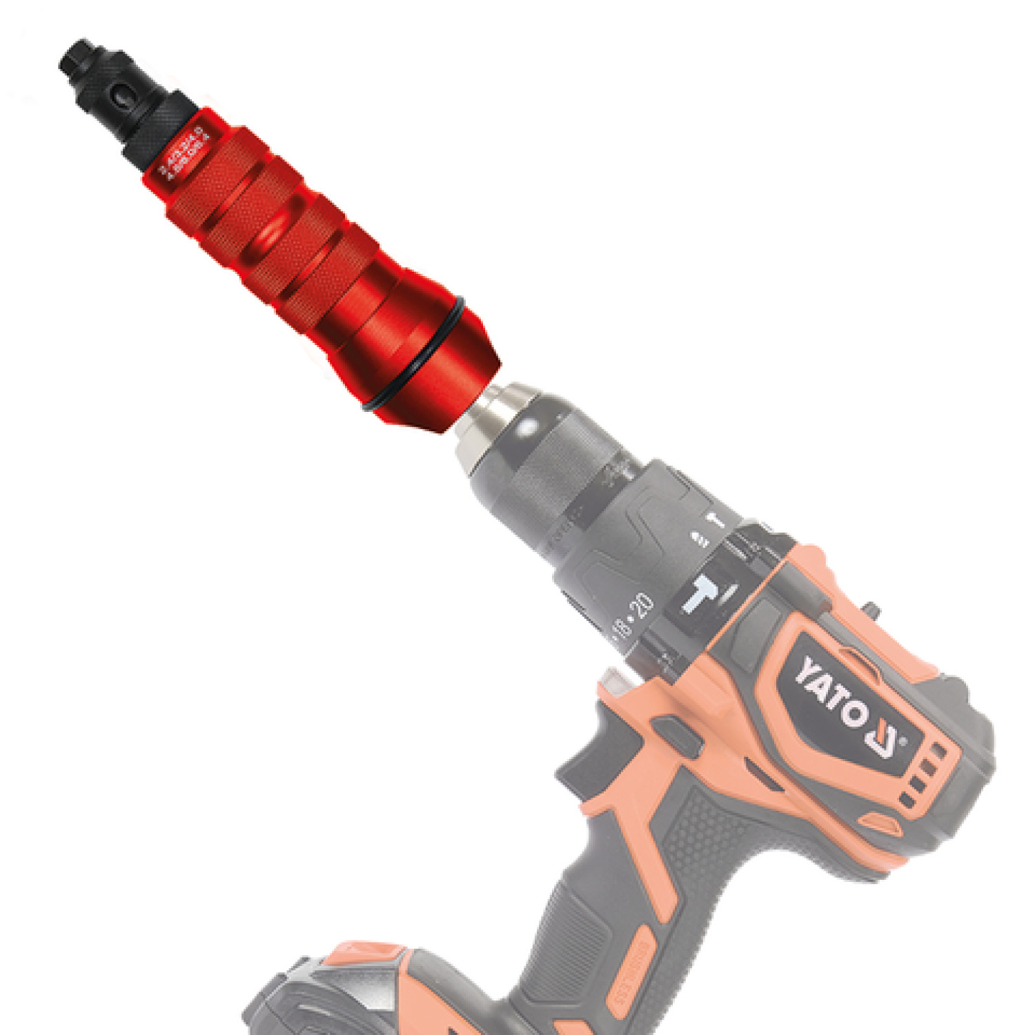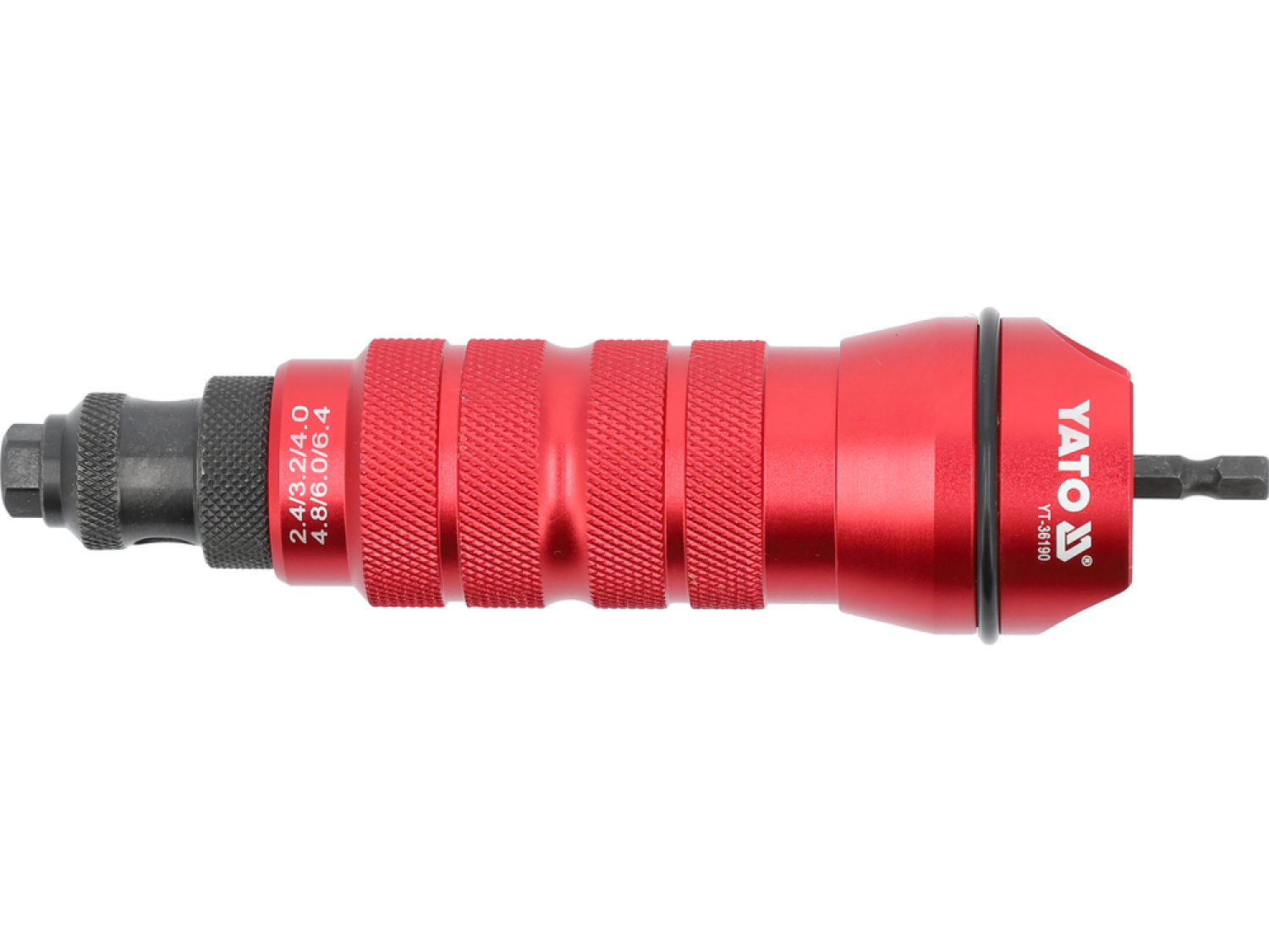 Kniedēšanas adapteris YATO modelis YT-36190 ir paredzēts lietošanai ar urbjmašīnām un noderēs, lai strādātu ar dažādu izmēru kniežām.