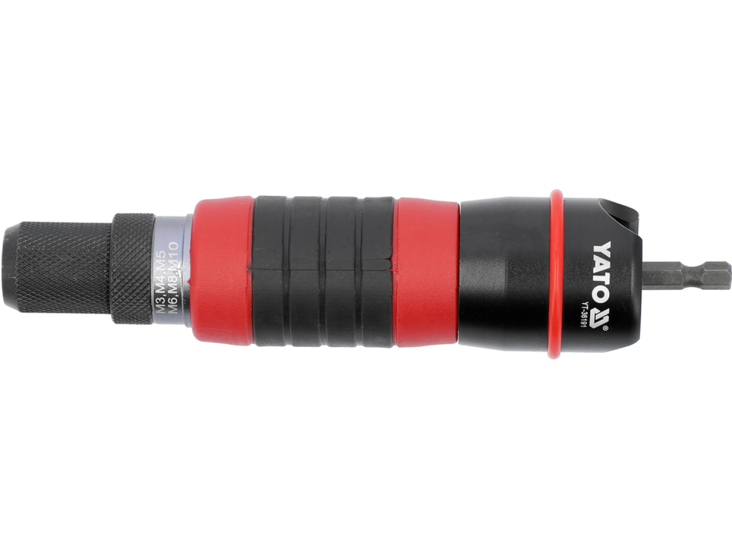 RIVETER NUT ADAPTER YT-36191 ir jābūt rīks, kas paredzēts kniedēšanas uzgriežņu izmantošanai kopā ar skrūvgriezi. Šis adapteris ir ideāls risinājums, lai nodrošinātu drošu un efektīvu savienojumu jūsu darbarīkiem.