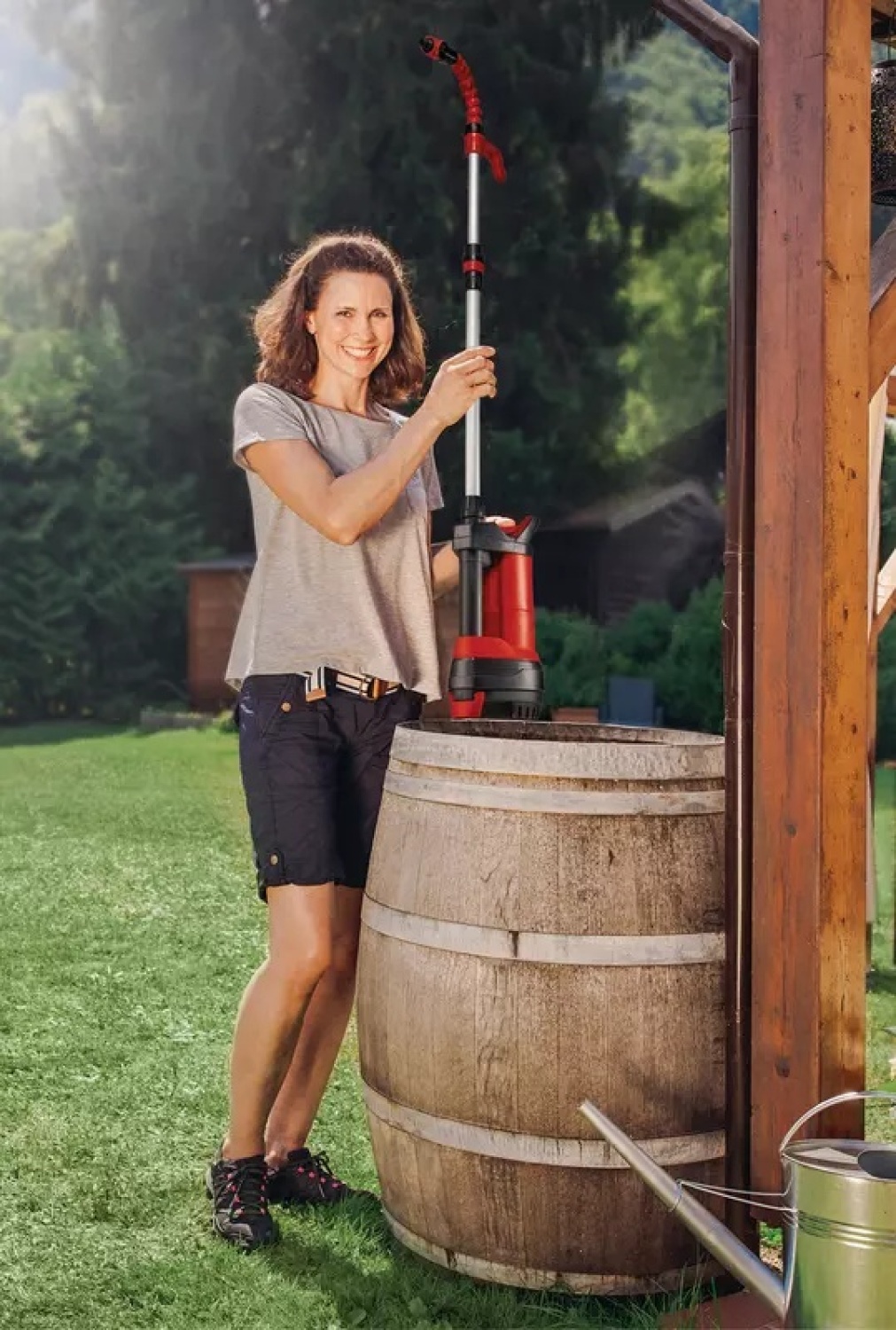 GE-PP 5555 RB-A iegremdējamais spiediena un lietus ūdens sūknis ir paredzēts plašam pielietojumam. To var izmantot kā iegremdējamu spiediena sūkni, piemēram, cisternā vai akā, un ar regulējamo savienojuma cauruli, piemēram, lietus ūdens tvertnē. Turklāt sūknis ir aprīkots ar inovatīvu automātisko funkciju, kas padara to ideāli piemērotu pakalpojumu ūdens piegādei mājās (izņemot dzeramo ūdeni) un dārza laistīšanai, izmantojot zāliena smidzinātāju vai dārza smidzinātāju. Vairāku posmu sūkņa piedziņa nodrošina augstu piegādes spiedienu, un automātiskā funkcija ar integrētu sausā palaišanas aizsardzību automātiski ieslēdz ierīci, kad ūdens ir nepieciešams, un pēc tam to izslēdz. Teleskopiskais pagarinājuma caurule ar elastīgu ūdens savienojumu un vārstu dārza šļūtenes novietošanai atbilstoši individuālām prasībām ir bezgalīgi regulējama. Sistēmu papildina turētājs ūdens tvertnes nostiprināšanai un praktiska kabeļa atvilkšanas iespēja kabeļa uzglabāšanai uz korpusa, kā arī ergonomisks rokturis. Lai nodrošinātu augstu kvalitāti un ilgu kalpošanas laiku, sūknim ir augstas kvalitātes mehāniskais blīvējums un izturīgs plastmasas korpuss.