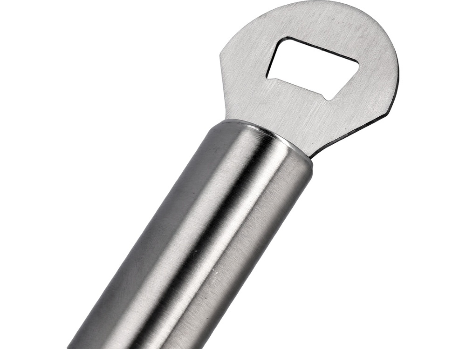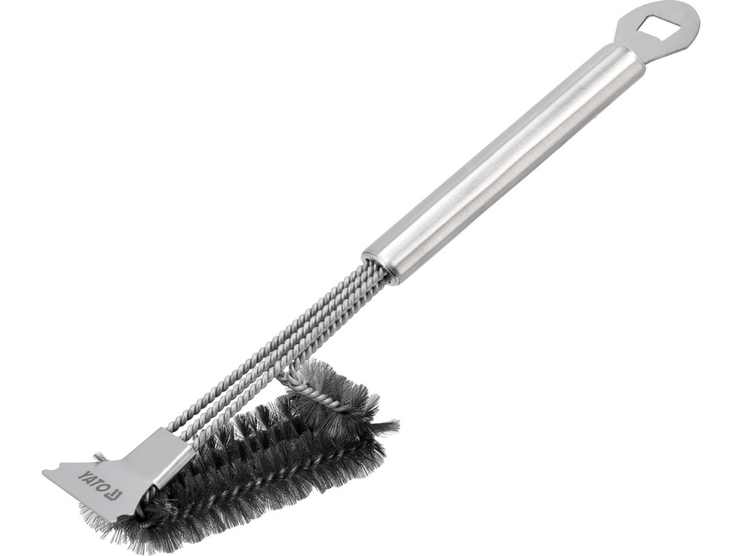 Steel grill brush with a scraper and bottle opener. Allows for thorough removal of burnt food residues, grease, charcoal from grates, grill surfaces, trays, ashtrays, and smokehouse chambers.