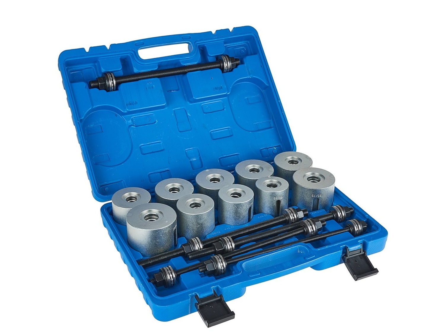 A profesionāls vilkšanas komplekts, kas paredzēts gultņu, gultņu apvalku un blīvju gredzenu uzstādīšanai un noņemšanai. Ideāli piemērots automobiļu darbnīcām, piekares servisa centriem un prasīgiem DIY entuziastiem, kuriem nepieciešama precizitāte, izturība un uzticamība.