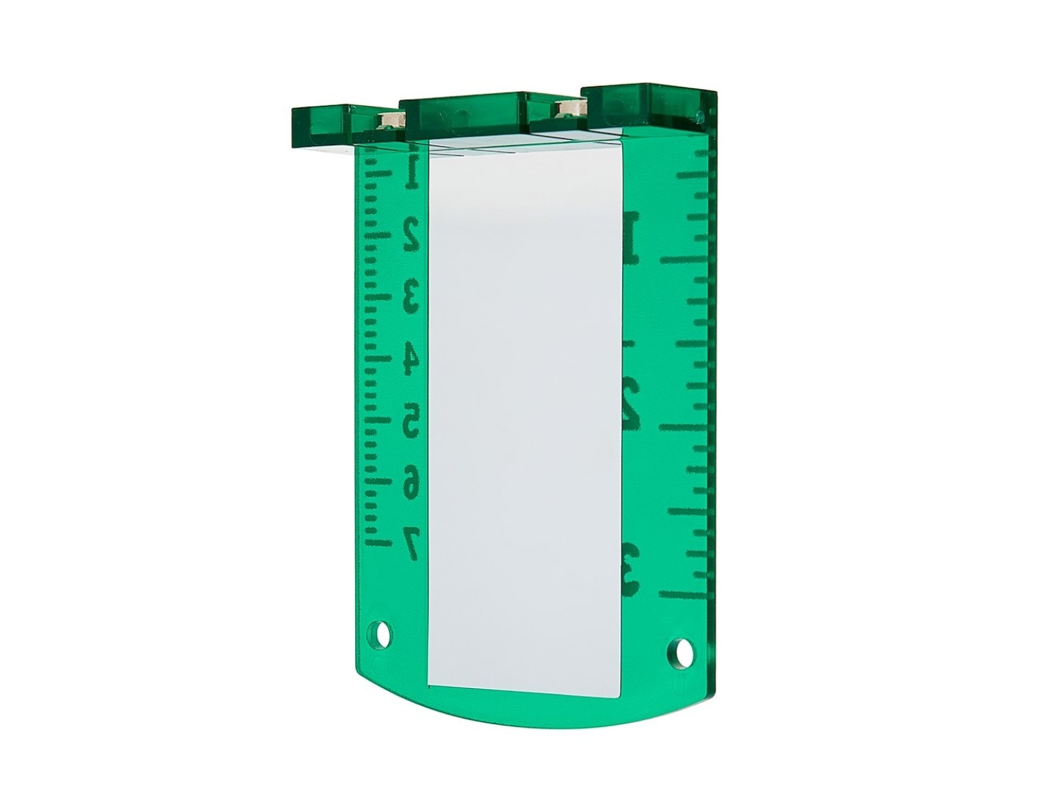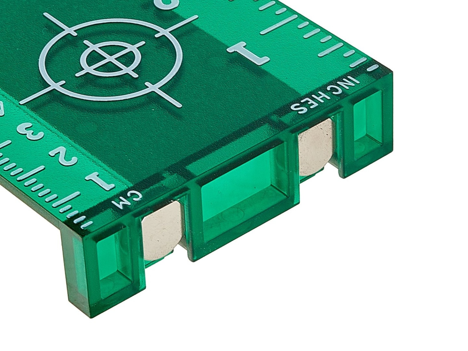 Mērījumu skalas – atzīmētas gan centimetros (cm), gan collās (inch) precīzai izlīdzināšanai un lāzera punkta nolasīšanai.