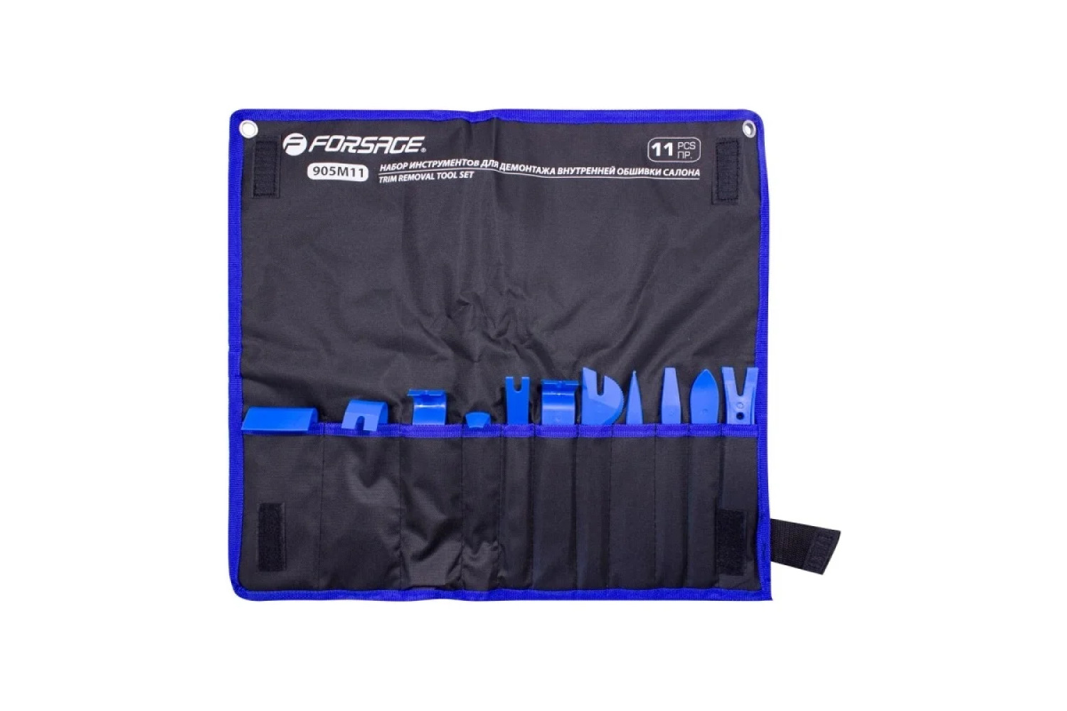 Iekšējās apdares demontāžas rīku komplekts no zīmola Forsage, modelis F-905M11, ir izstrādāts, lai nodrošinātu ērtu un precīzu automašīnas interjera apdares noņemšanu, nesabojājot iekšējos elementus.