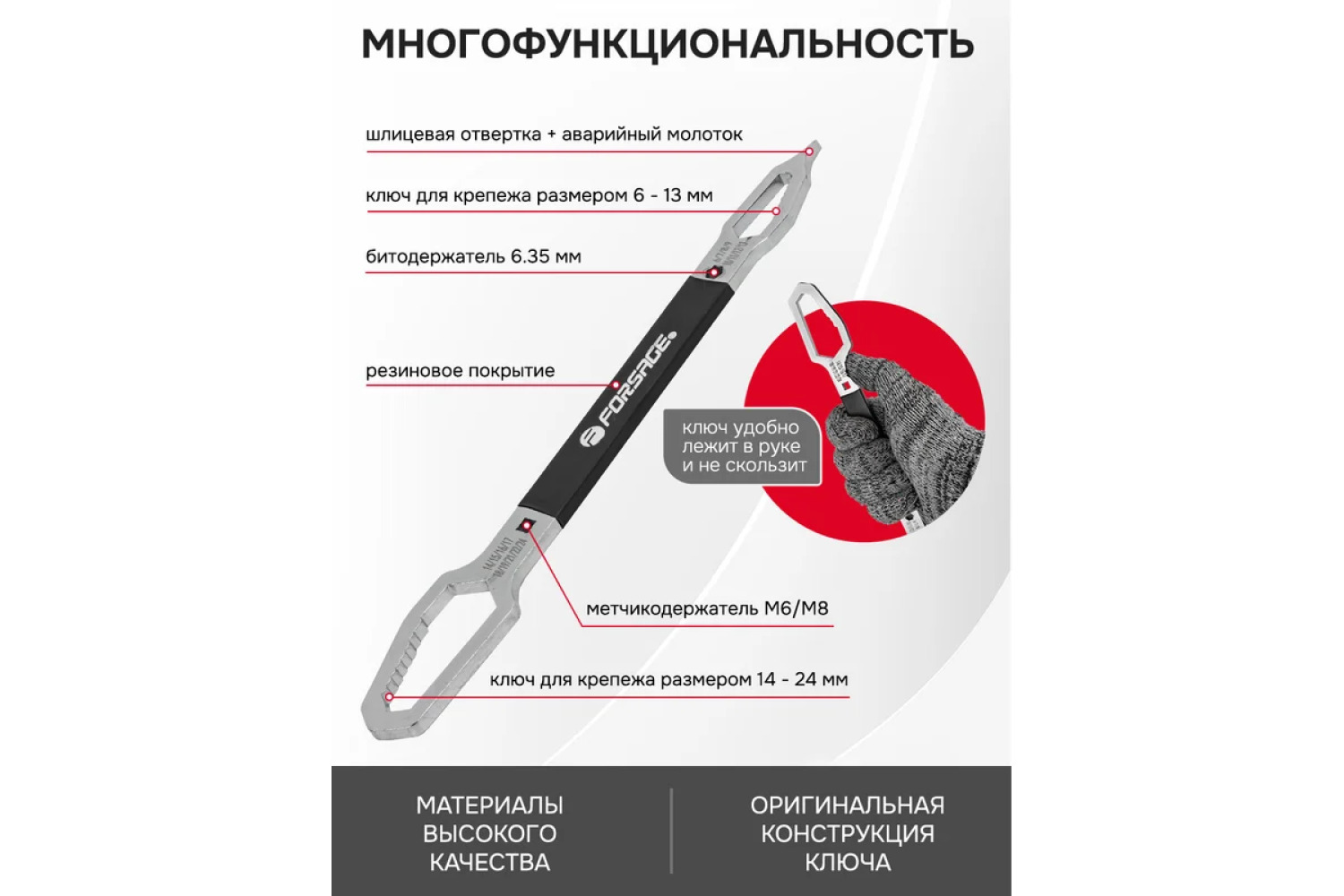 Pateicoties oriģinālajai konstrukcijai, tā ļauj ar vienu atslēgu atskrūvēt uzgriežņus no 14-24 mm vienā pusē un 6-13 mm otrā pusē. Šī daudzfunkcionālā uzgriežņu atslēga darbojas pēc trieciena vai regulējamās atslēgas principa, kas padara to ērtu, jo nepieciešamo izmēru var atrast ar vienu pāreju uz citu malu. Pašregulējošā tehnoloģija ļauj atslēgai automātiski pielāgoties skrūvju un uzgriežņu izmēriem un formai, neatkarīgi no tā, vai tās ir apaļas vai sešstūra.