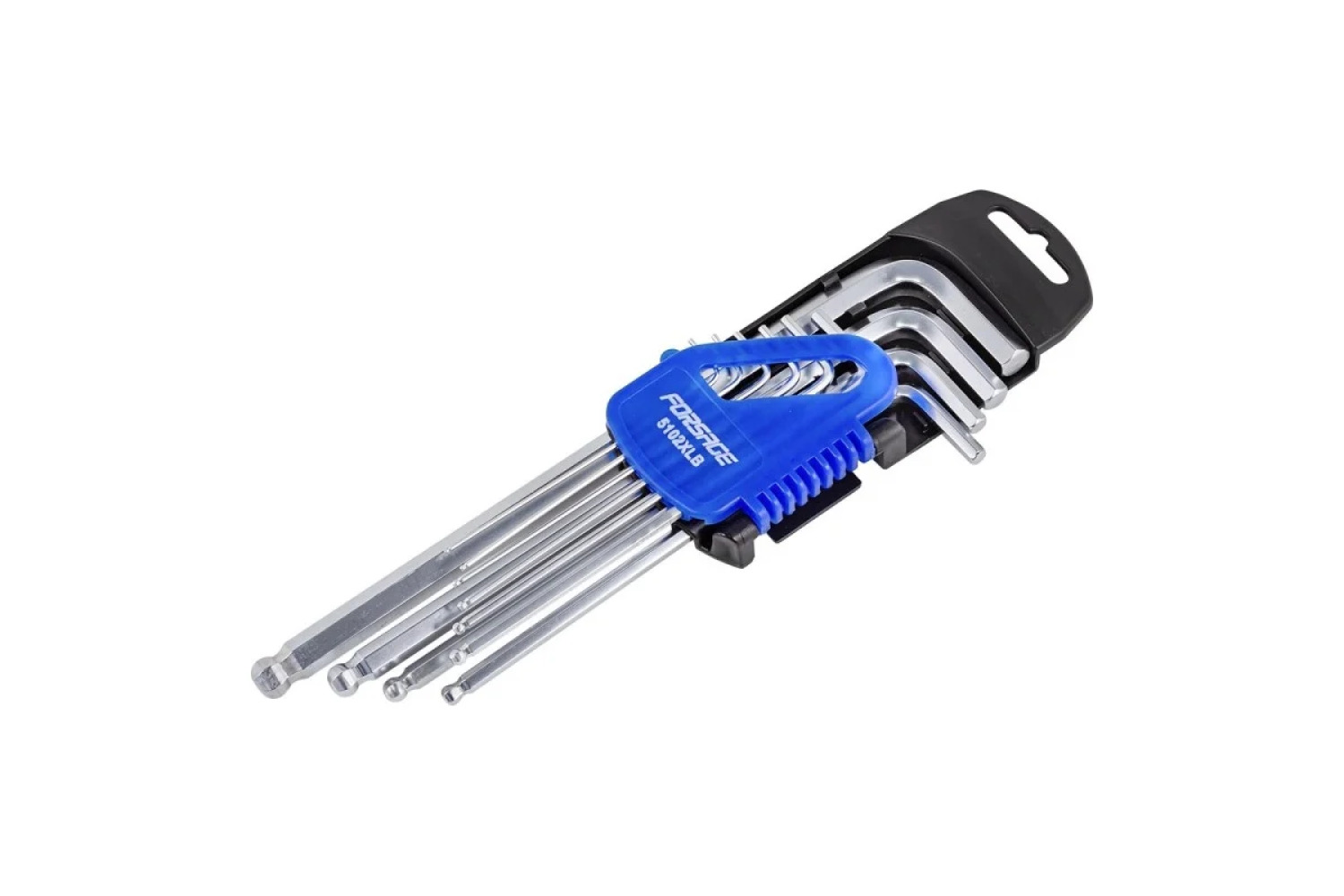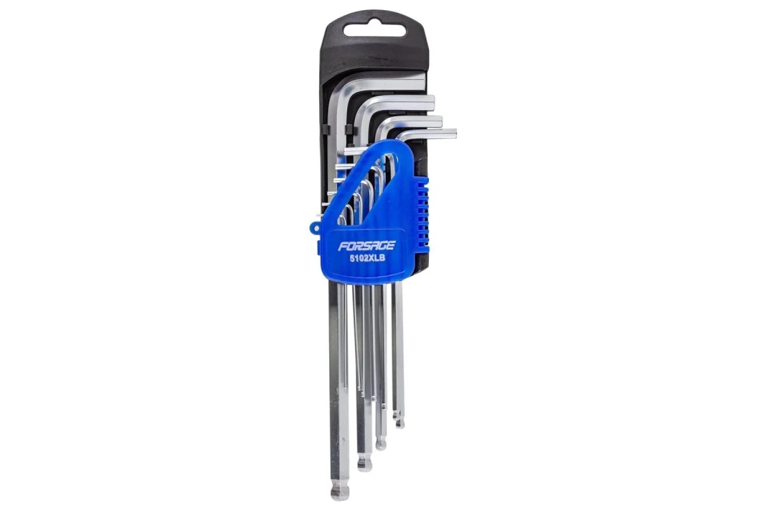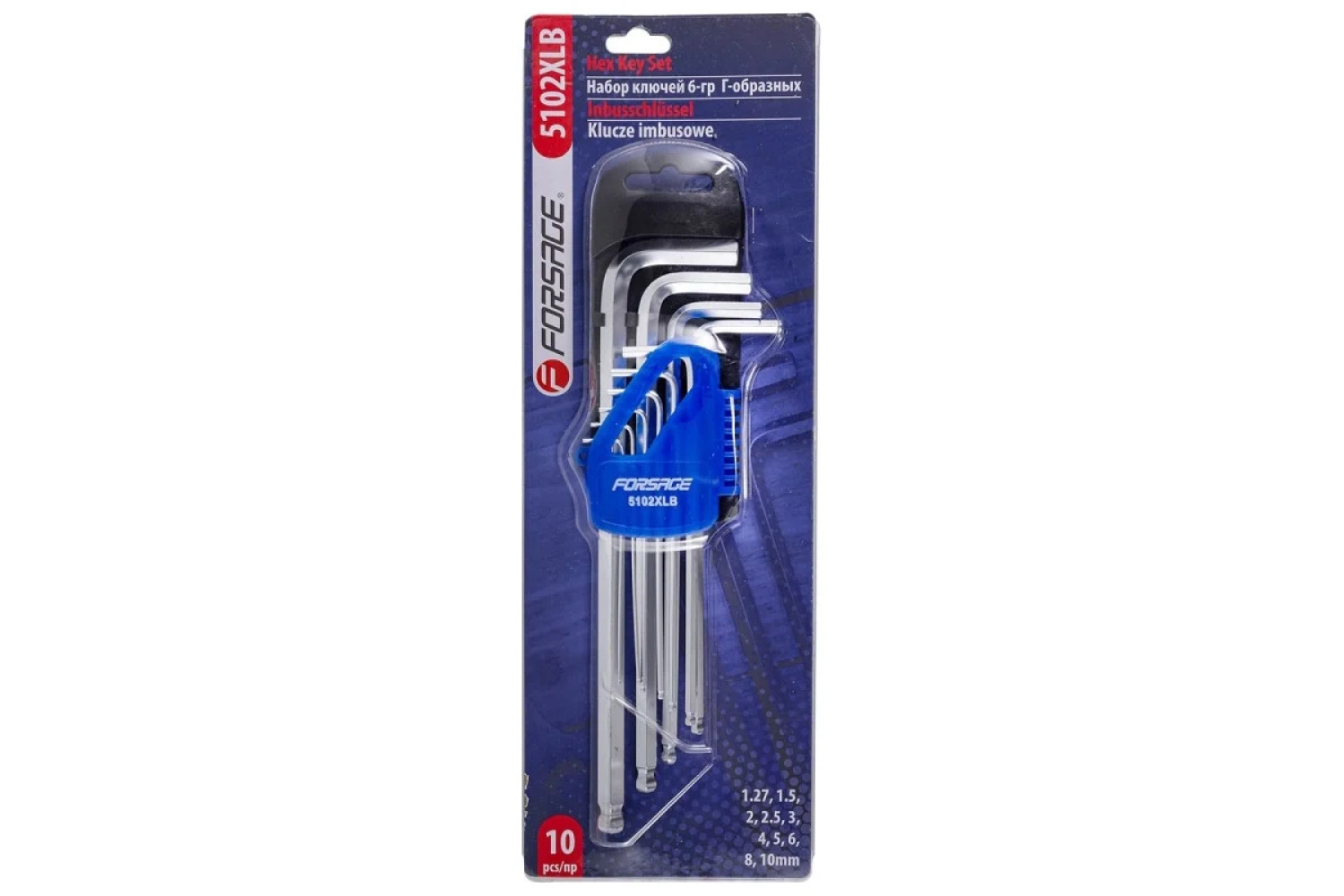Sešstūra L-veida atslēgu komplekts ar bumbu no zīmola FORSAGE (modelis F-5102XLB) ir paredzēts skrūvju un uzgriežņu pievilkšanai un atskrūvēšanai, izmantojot HEX tipa slīpumu. Komplektā ietilpst 10 atslēgas, katra ar unikālu izmēru un garumu, kas ļauj efektīvi strādāt ar dažādiem stiprinājumiem.