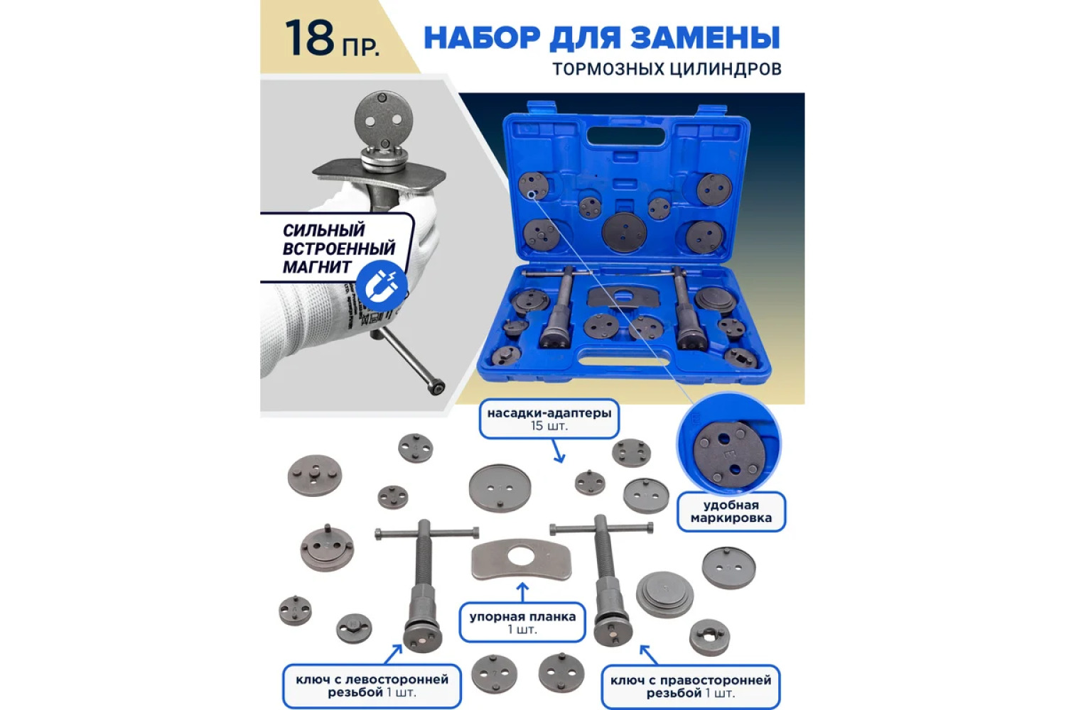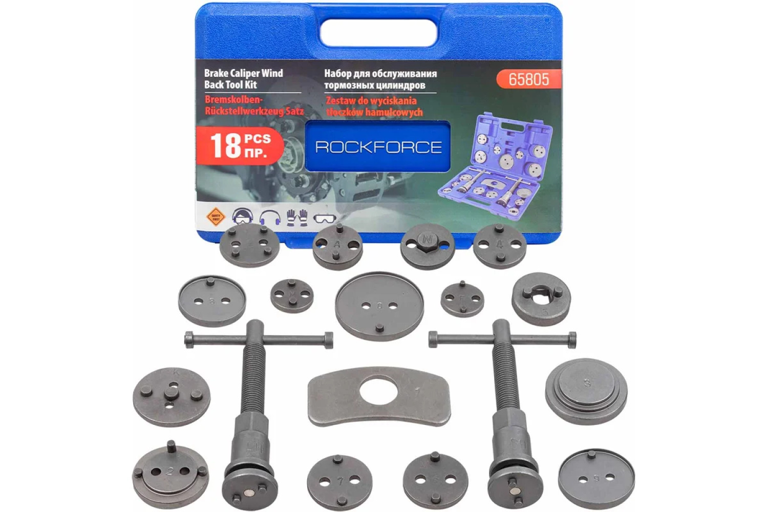 Instrumentu komplekts Rockforce RF-65805 ar 18 priekšmetiem ir paredzēts automašīnu bremžu cilindru apkalpošanai, nodrošinot to nospiešanu remontā un apkalpošanā. Tas ir izstrādāts, lai strādātu ar dažādiem bremžu cilindru veidiem, tostarp ar labās un kreisās puses piedziņu.
