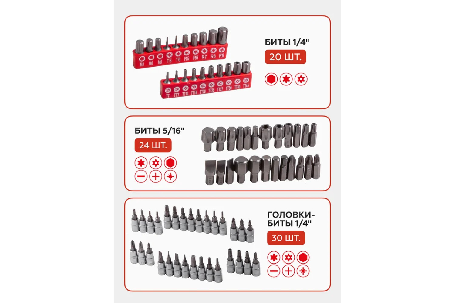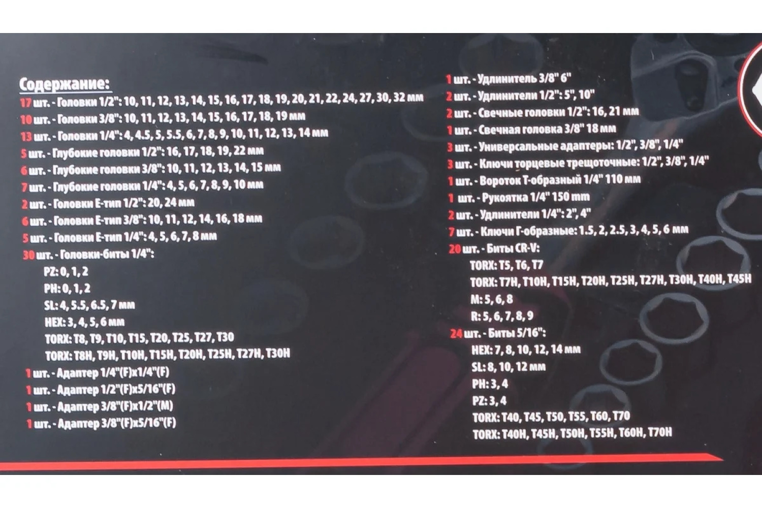 • 24 gab. - Bitītes 5/16": HEX: 7, 8, 10, 12, 14 mm SL: 8, 10, 12 mm PH: 3, 4 PZ: 3, 4 TORX: T40, T45, T50, T55, T60, T70 TORX: T40H, T45H, T50H, T55H, T60H, T70H