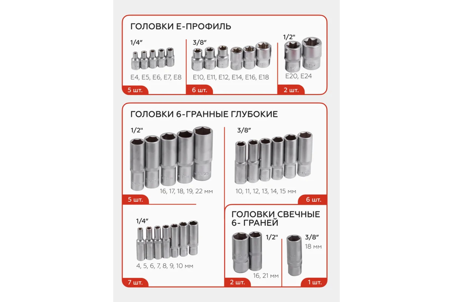 • 6 gab. - Dziļās galvas 3/8": 10, 11, 12, 13, 14, 15 mm