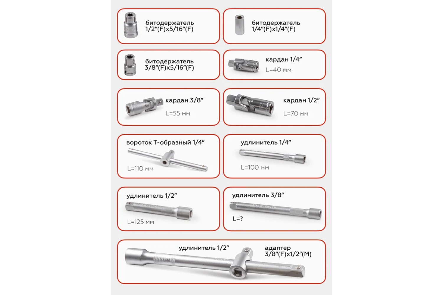 Šis komplekts ietver plašu instrumentu klāstu ar dažādiem kvadrātveida savienojumiem: