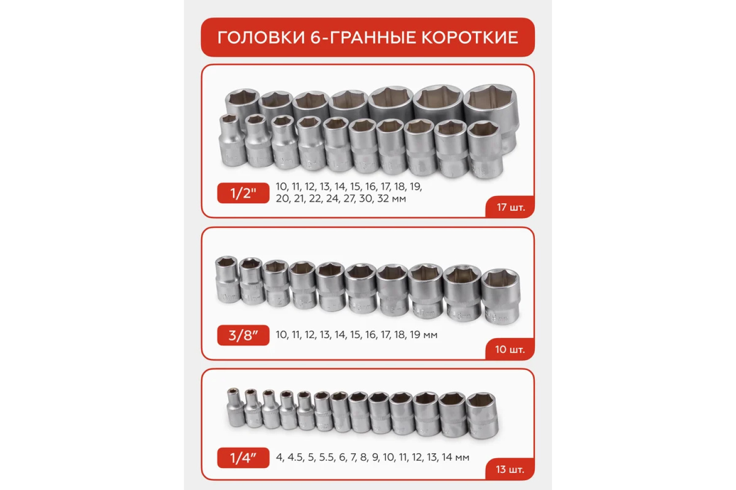 • 17 gab. - Galvas 1/2": 10, 11, 12, 13, 14, 15, 16, 17, 18, 19, 20, 21, 22, 24, 27, 30, 32 mm