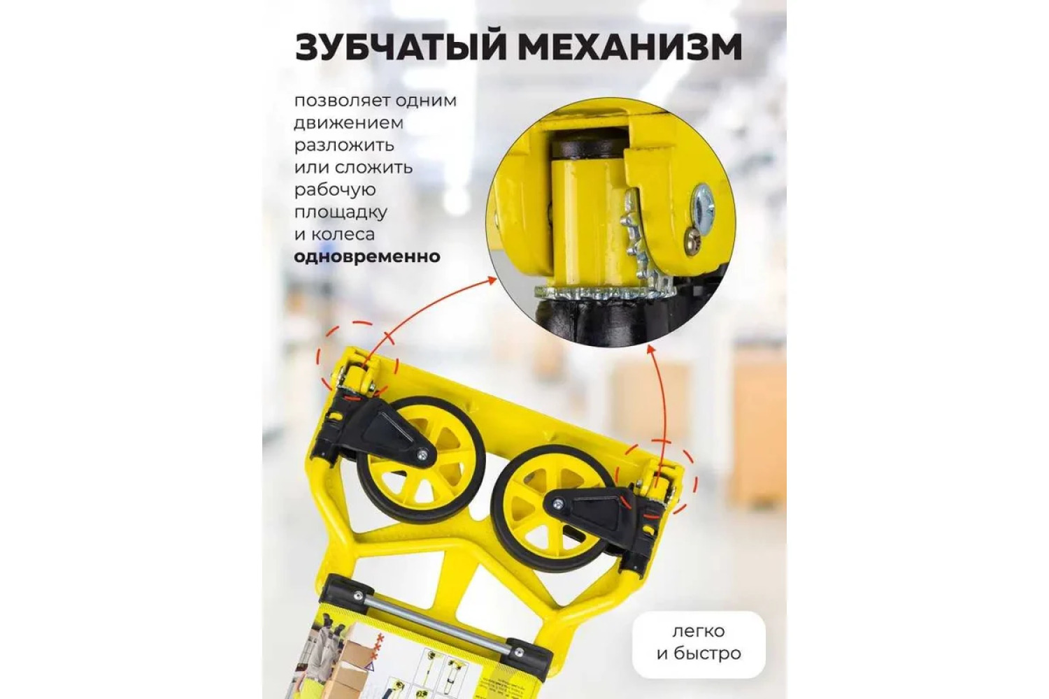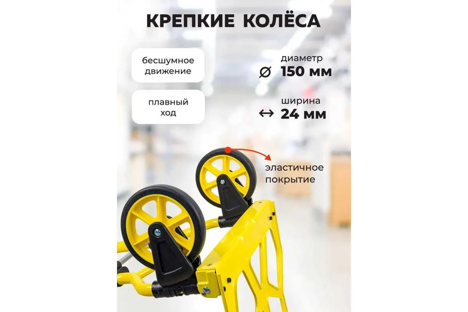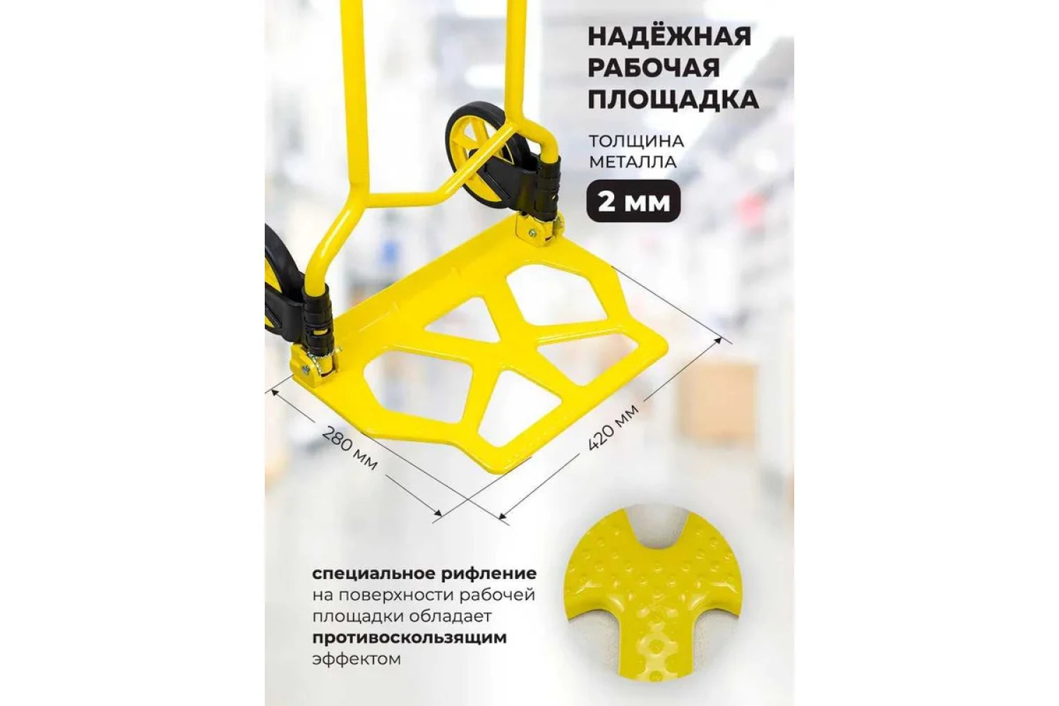 Ratiņi ir aprīkoti ar platformu izmērā 420×280 mm, kas ir pārklāta ar pretslīdes virsmu, nodrošinot stabilitāti preču transportēšanas laikā. Arī riteņu pāri, kuru diametrs ir 150 mm, nodrošina gludu un klusu kustību, ļaujot viegli pārvietoties pa nelīdzenu segumu.