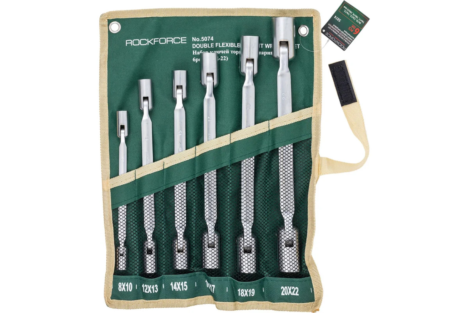 Šarnīrveida uzgriežņu atslēgu komplekts ar 12-galvu, 6 gabali (8x22mm), uz auduma. Atslēgas darba galva, kas veidota kā burts “O”, apņem skrūves galvu vai uzgriezni no visām pusēm, nodrošinot maksimālu kontaktu virsmu, kas būtiski samazina iespēju slīdot, pielietojot lielu spēku. Parasti tiek ražotas divpadsmit-galvas, lai būtu ērti lietojamas ierobežotās vietās. Šīs atslēgas ļauj atskrūvēt skrūves, kurām nav pieejams tiešais instruments. Tās ir paredzētas darbam ar vītņotiem savienojumiem grūti pieejamās vietās. Komplekts izgatavots no augstas kvalitātes hromvaniķeļa tērauda, kas ievērojami pagarina produkta kalpošanas laiku. Audums - turētājs, ērtai uzglabāšanai un transportēšanai.