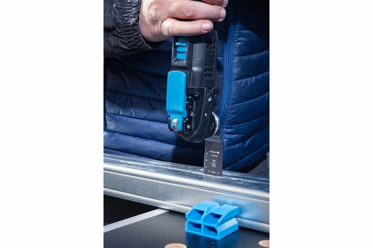 Šis metāla zāģa asmens ir izstrādāts, lai to varētu piestiprināt pie multitīkla, piemēram, HT2E230-0MT. Tas ir ideāli piemērots dzelzs un nemetāla metālu, PVC un naglām piestiprināta koka griešanai. Asmens izceļas ar izcilu izturību un nodilumizturību, pateicoties bi-metāla (BIM) izmantošanai, kas apvieno instrumentu tērauda stiprumu ar M42 augstākā ātruma tērauda augsto cietību. Pārdomātā forma un platums ļauj veikt iegriezumus un garengriezumus pat grūti sasniedzamās vietās. Universālais darba gala stiprinājums der lielākajai daļai multitīklu tirgū.