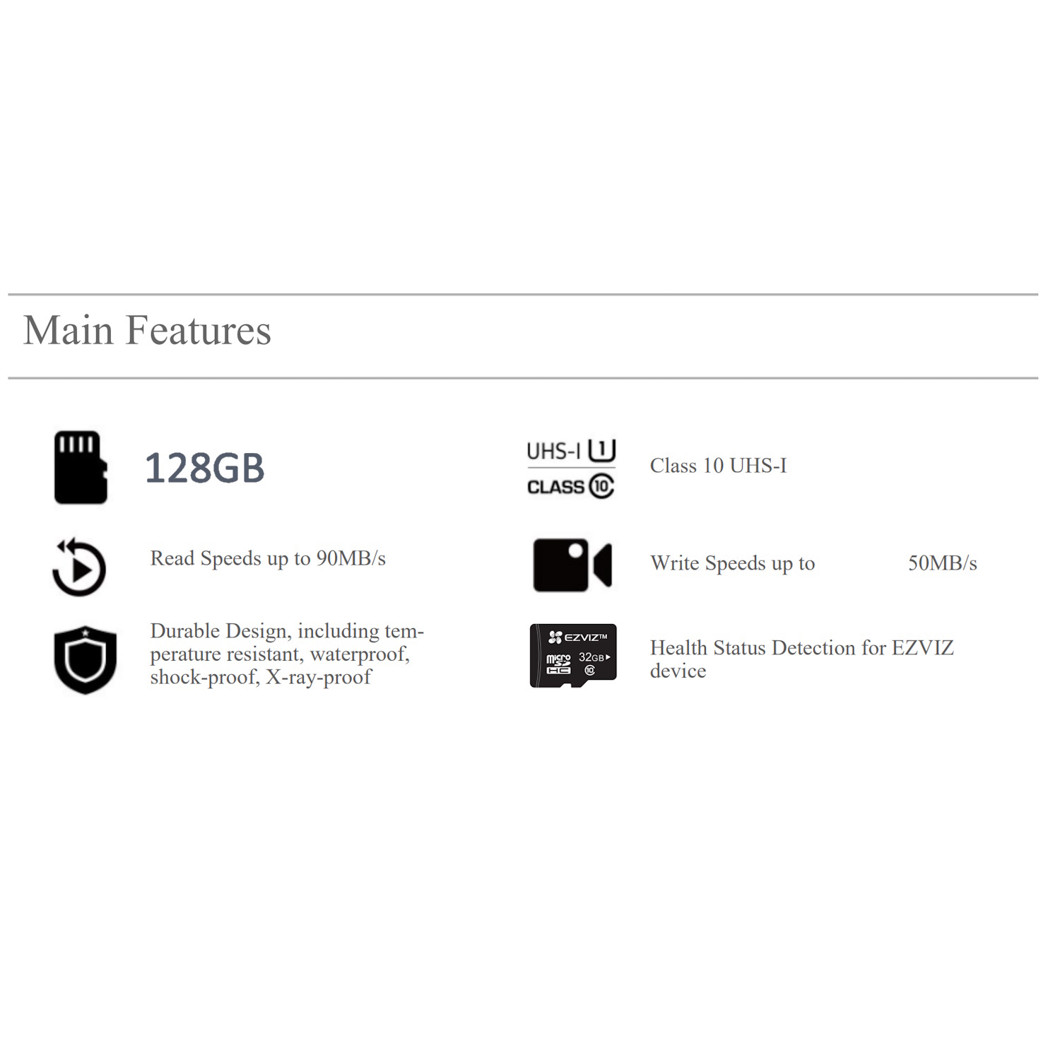 EZVIZ 128GB UHS-I 10.klase Viedā MicroSD Karte ir izstrādāta augstas veiktspējas videofilmēšanai un drošai datu glabāšanai. Ar lielu 128GB ietilpību, ultra ātru lasīšanas un rakstīšanas ātrumu, kā arī izturīgu izturību, šī MicroSD karte ir ideāls risinājums EZVIZ drošības kamerām un plaša klāsta citiem saderīgiem ierīcēm. Neatkarīgi no tā, vai jūs uzņemat Full HD kadrus vai paplašināt sava mobilā ierīces atmiņu, šī karte nodrošina smoothing un uzticamu veiktspēju.