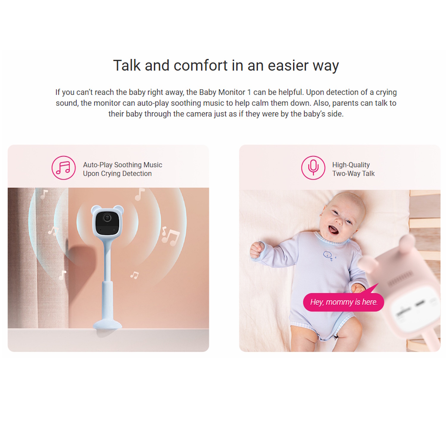 ✔ Divvirzienu audio komunikācija – Sarunājieties ar savu mazuli jebkurā laikā ar iebūvēto mikrofoni un skaļruni, sniedzot mierinājumu pat tad, ja esat citā istabā.