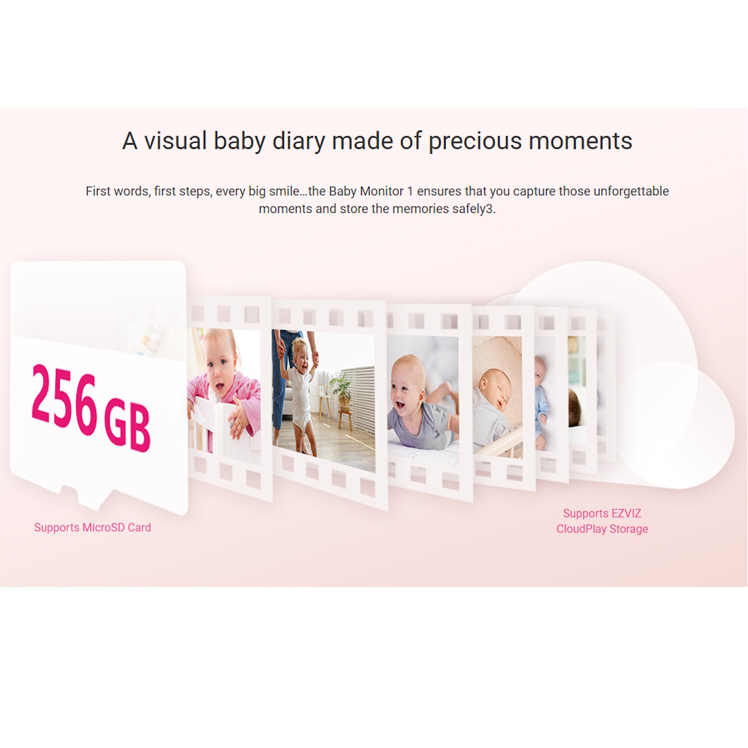 ✔ EZVIZ mākoņa un MicroSD krātuve ( līdz 256GB) – Saglabājiet sava bērna vērtīgos mirkļus vietēji uz MicroSD kartes vai droši EZVIZ CloudPlay.