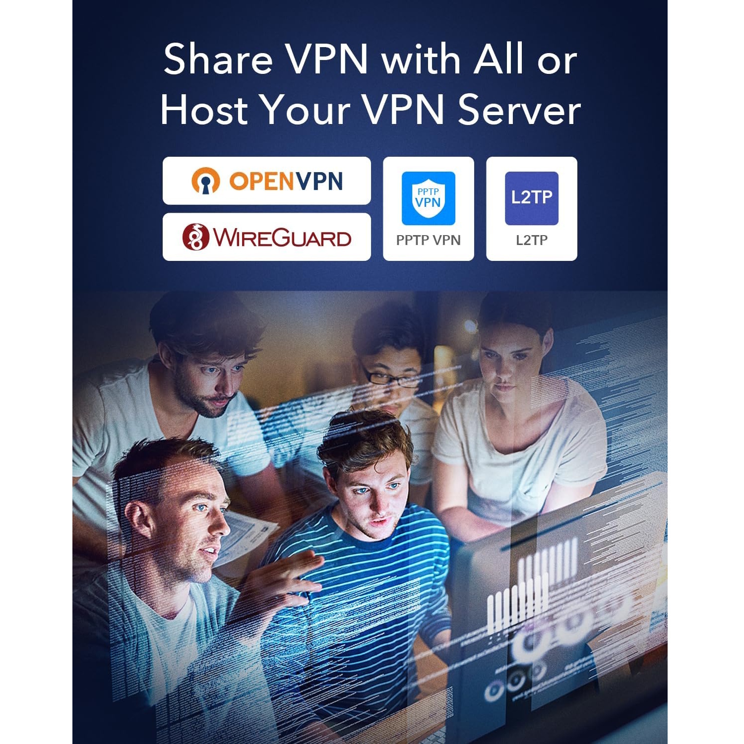 Atbalsta WireGuard, OpenVPN, IPsec, PPTP, L2TP un Zerotier, nodrošinot militāru līmeņa šifrēšanu attālinātai darbam vai privātuma lietojumprogramām.