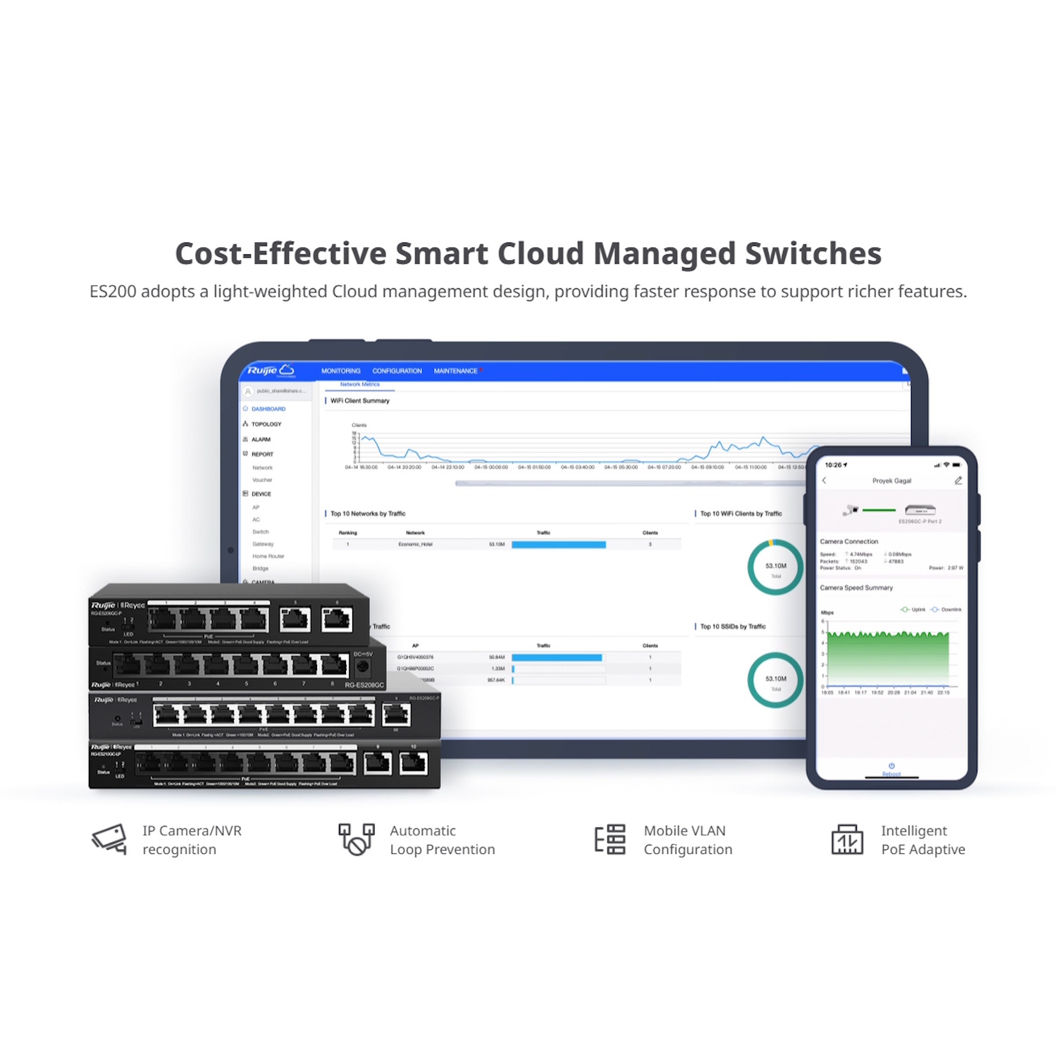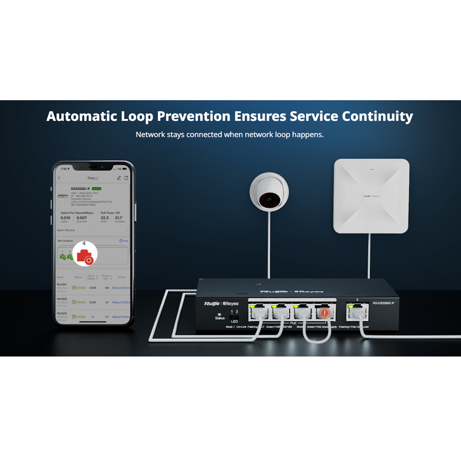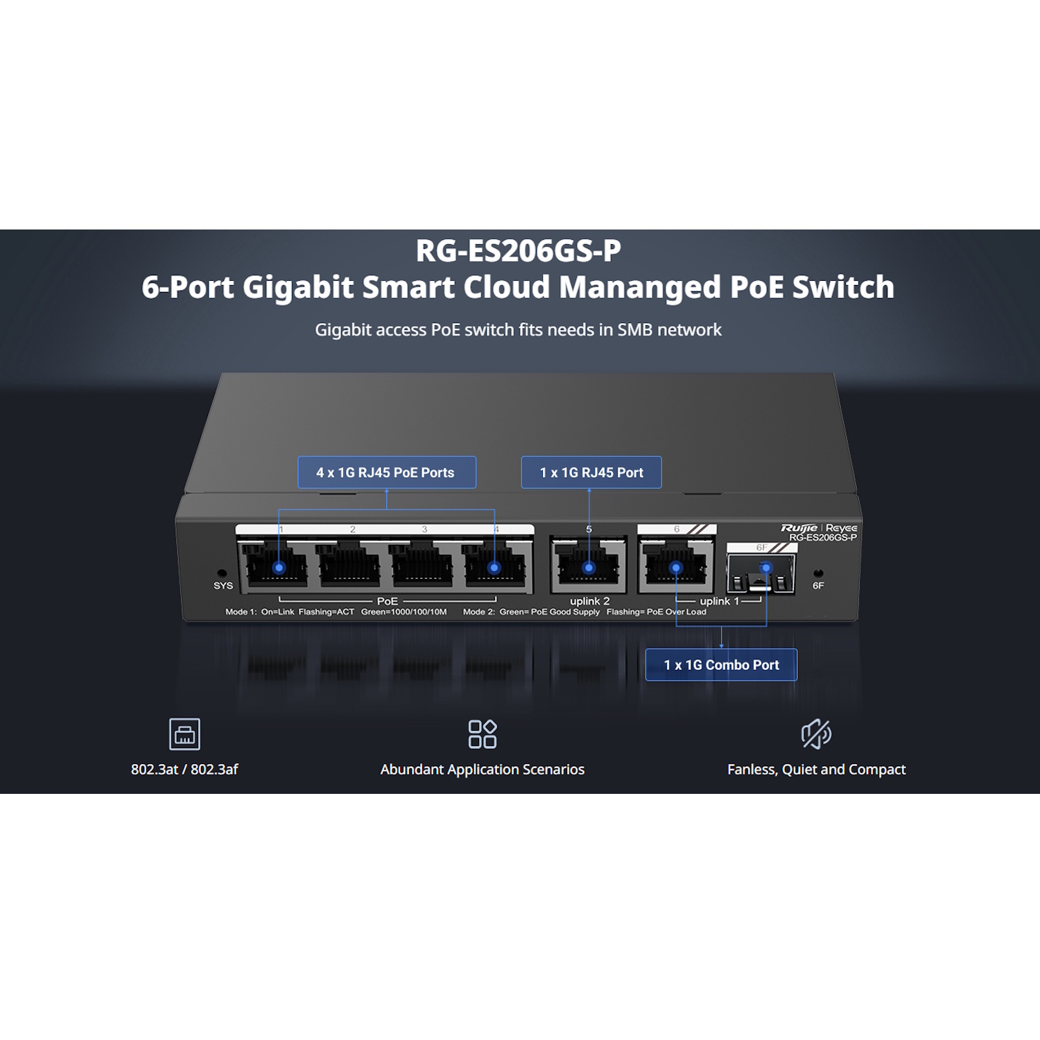 Ruijie RG-ES206GS-P ir mākoņa gudrs 6-portu Gigabit PoE slēdzis, kas pielāgots uzraudzības, mazumtirdzniecības un mazu uzņēmumu scenārijiem, kuros nepieciešama gan attālināta redzamība, gan enerģijas piegāde. Ar 4× PoE+ portiem, 2× uplink portiem, 6kV pārsprieguma aizsardzību, un atbalstu Ruijie Cloud platformai, tas nodrošina gan gudru centralizētu pārvaldību, gan uzticamu 24/7 darbību IP ierīcēm.