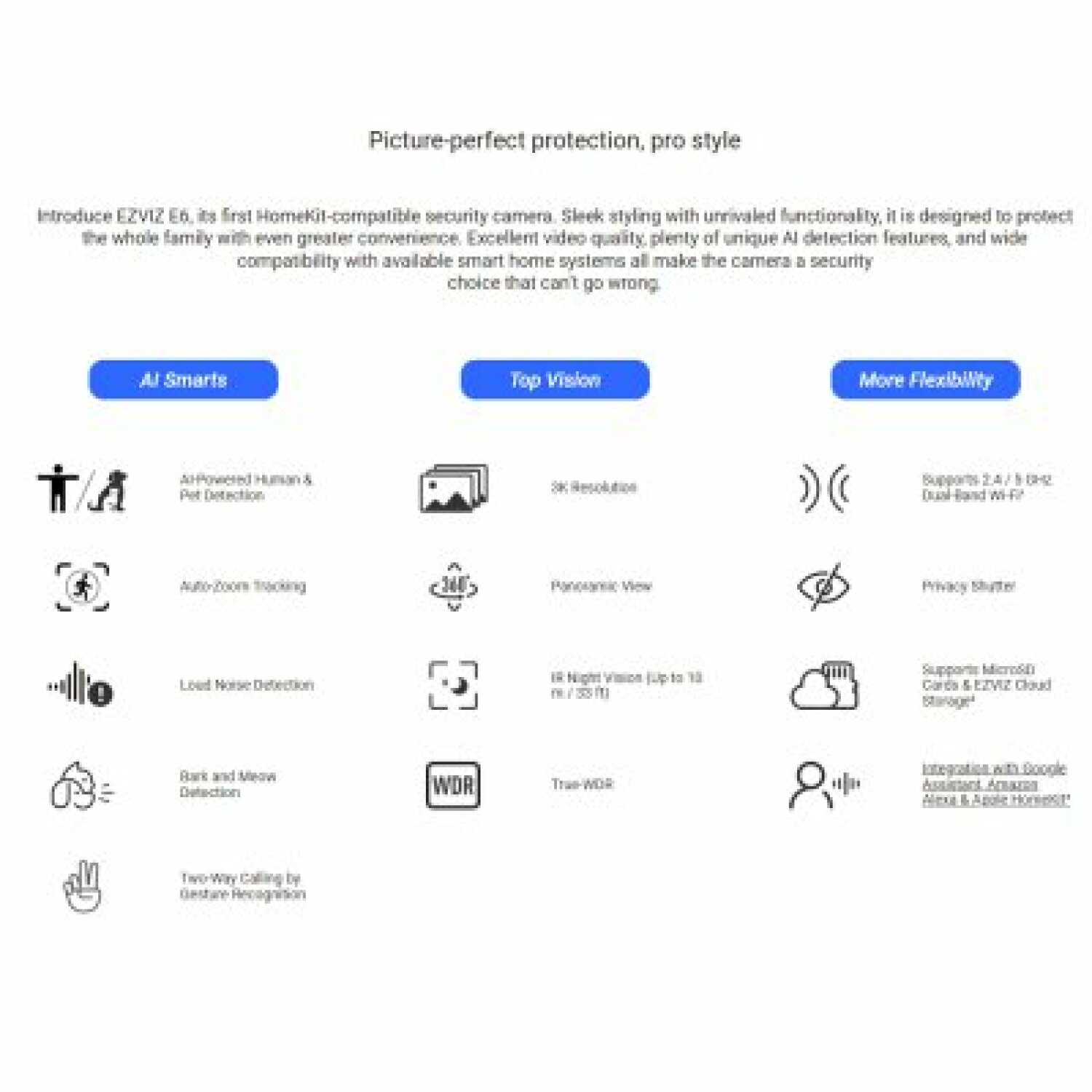 Viegli integrējiet E6 savā esošajā viedās mājas iestatījumā, kas ir saderīgs ar Amazon Alexa, Google Assistant un Apple HomeKit, uzlabojot jūsu drošības sistēmu ar uzlabotām funkcijām un ērtām kontroļu iespējām.