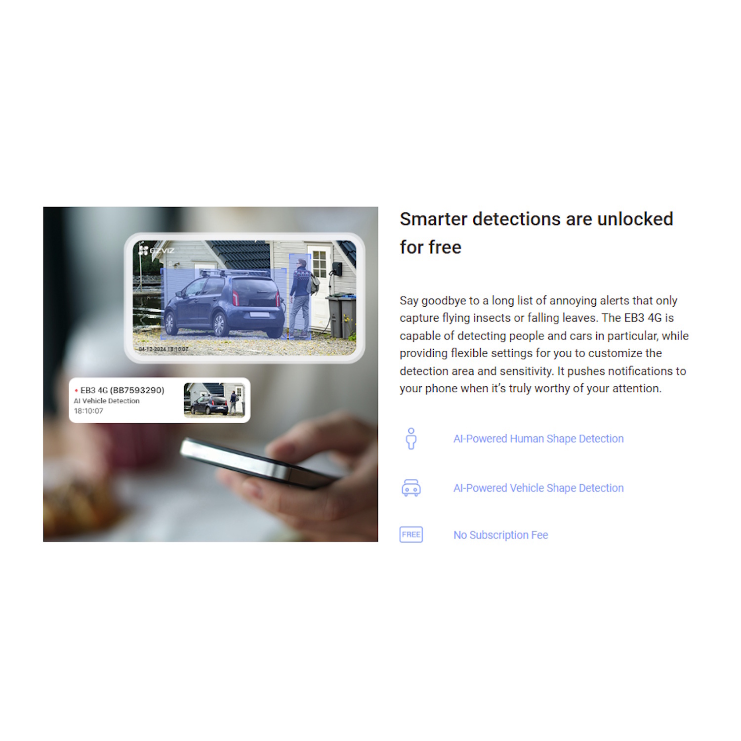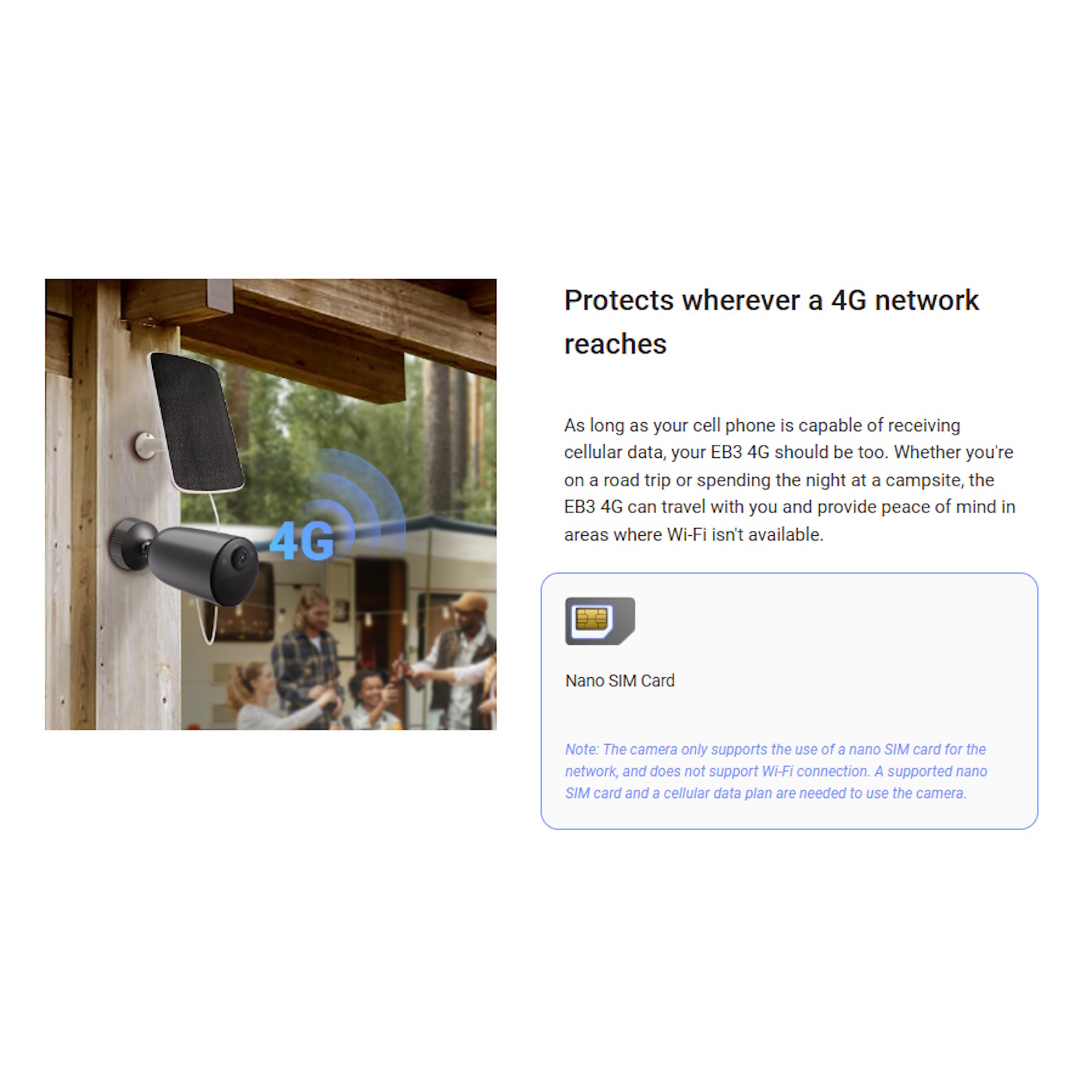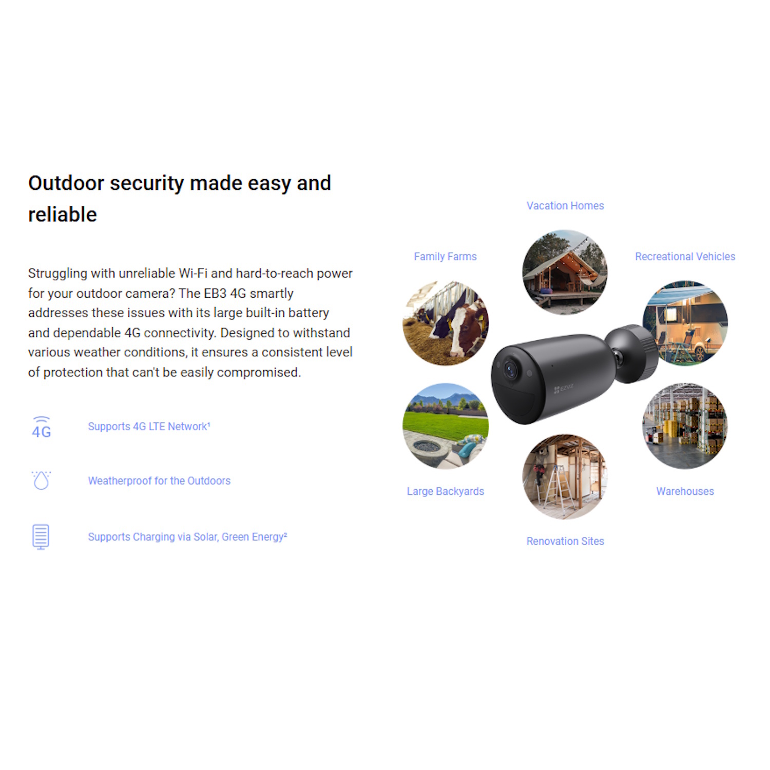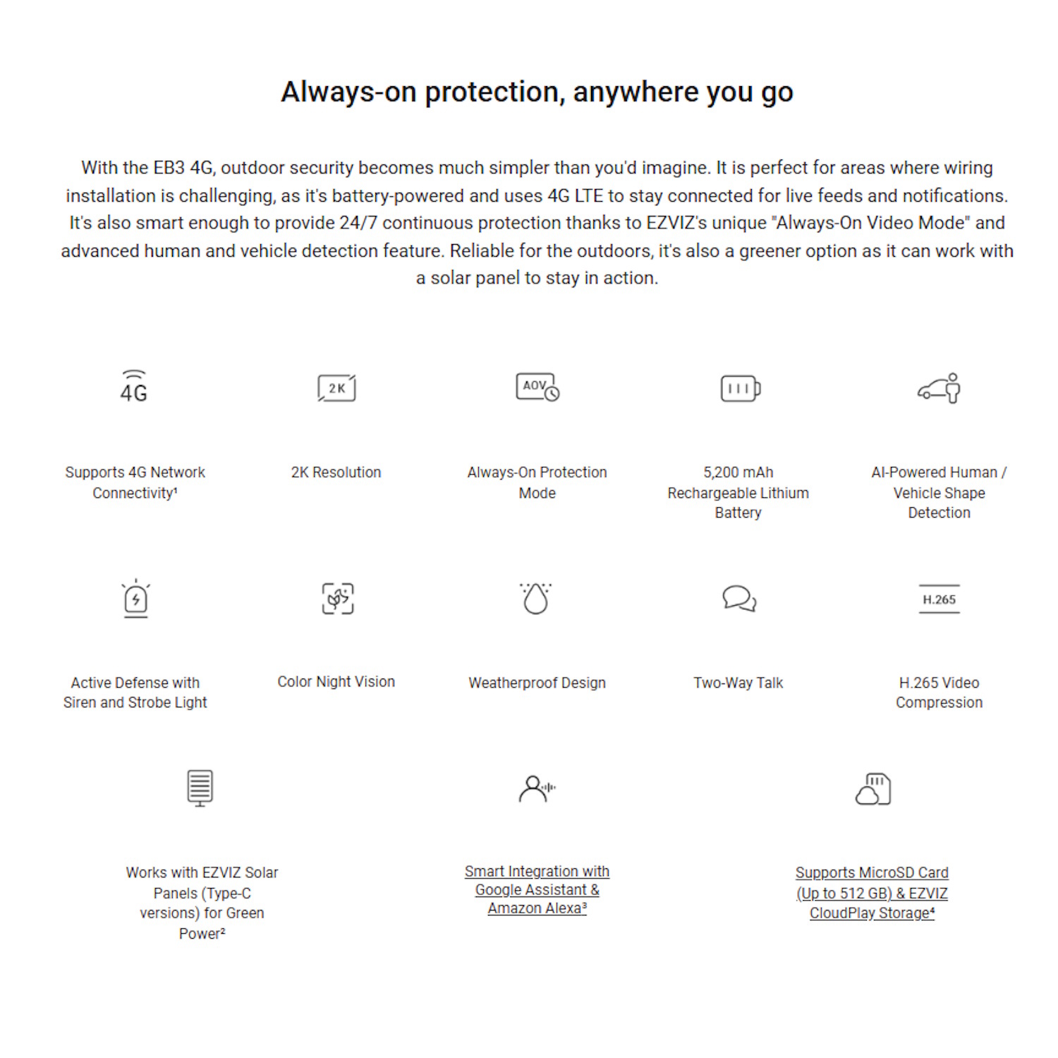 Darbināts ar 5200 mAh uzlādējamu akumulatoru un iekļauto 5W saules paneli, EB3 4G nodrošina 3MP ultra-šķidru video, AI cilvēku un transporta līdzekļu atpazīšanu un krāsu nakts redzēšanu — pat bez piekļuves Wi-Fi vai elektroapgādes līnijām. Tās AOV režīms nodrošina 24/7 autonomu aizsardzību ar viedu enerģijas pārvaldību.