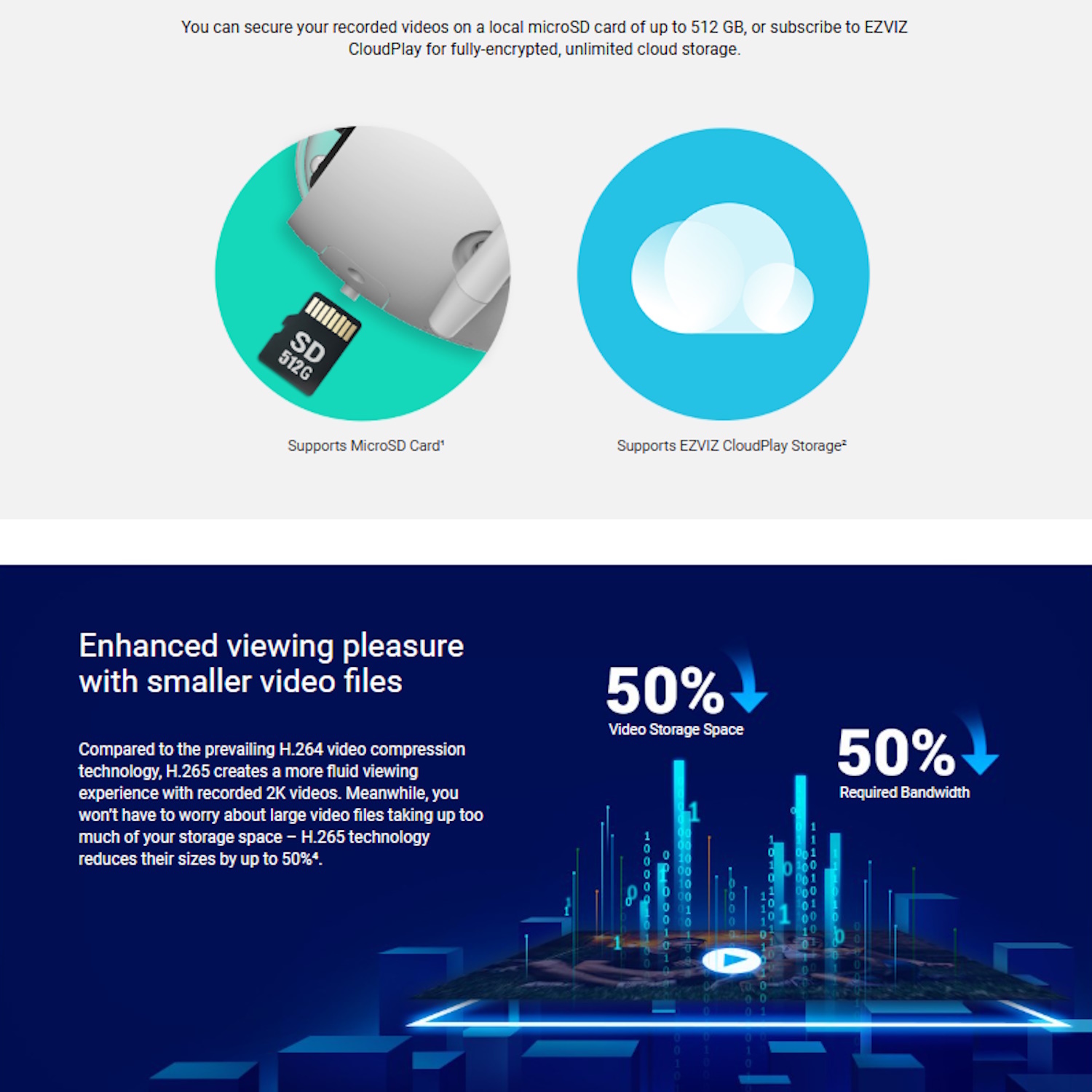 • Uzglabāšana: Atbalsta MicroSD karti (līdz 512GB) un EZVIZ CloudPlay
