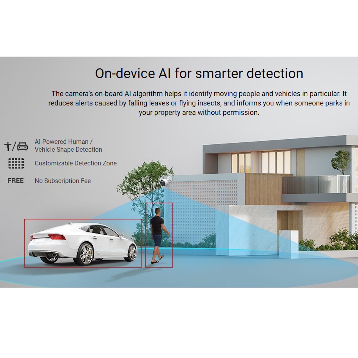 • AI Darbināta Cilvēku un Transportlīdzekļu Detekcija – Samazina viltus trauksmes, nošķirot cilvēkus un transportlīdzekļus no citiem kustīgiem objektiem, piemēram, dzīvniekiem vai laika apstākļu elementiem.