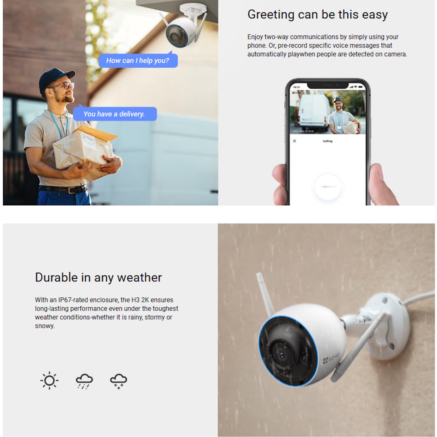 • Laika Apstākļu Izturība (IP67) – Izgatavota ar izturīgu, visu metāla korpusu, EZVIZ H3 iztur lietu, putekļus, sniegu un ekstremālas temperatūras, padarot to ideāli piemērotu visa gada āra drošībai.