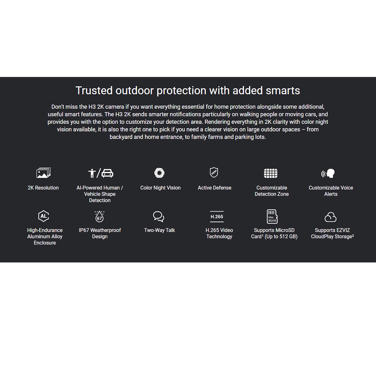 Ar inteliģentu kustību izsekošanu, aktīvu aizsardzības sirēnu un stroboskopa gaismu, kā arī H.265 kompresiju efektīvai uzglabāšanai, EZVIZ H3 nodrošina uzlabotu drošību, vieglu attālinātu piekļuvi, izmantojot EZVIZ lietotni, un bezšuvju viedās mājas integrāciju.
