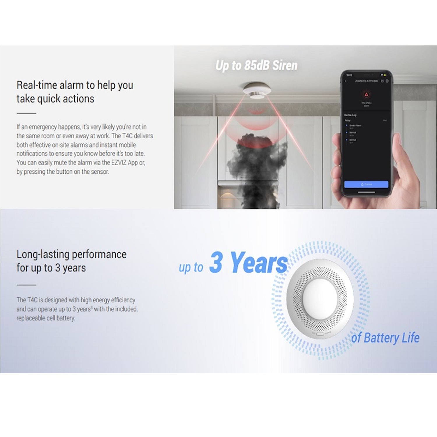 Pilnīgi Apple HomeKit saderīgs, T4C detektors vienkārši savienojas ar EZVIZ A3 Gateway, ļaujot saņemt momentālus paziņojumus, viedās mājas automatizāciju un tālvadību no jebkuras vietas. Ar 85dB skaļām trauksmēm, iebūvētu zibspuldzi un ultrazemu enerģijas patēriņu, T4C ir būtiska papildinājums jebkurai viedās mājas drošības sistēmai.
