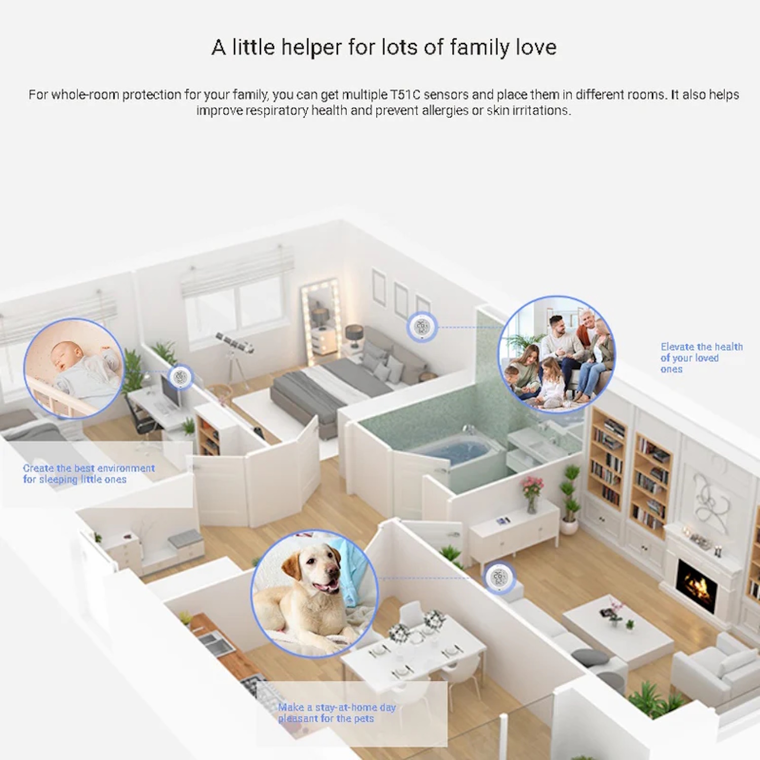 Saņemiet nekavējoties mobilus brīdinājumus, automatizējiet klimata kontroli un uzraugiet izmaiņas no jebkuras vietas—vai tas būtu, pielāgojot apkuri, dzesēšanu vai uzturot ideālu mitrumu ģimenes veselībai, augiem vai mājdzīvniekiem. Ar zema enerģijas patēriņa Zigbee 3.0 savienojamību un līdz 12 mēnešu akumulatora darbības laiku, T51C ir ideāla sastāvdaļa jūsu viedās mājas ekosistēmā.