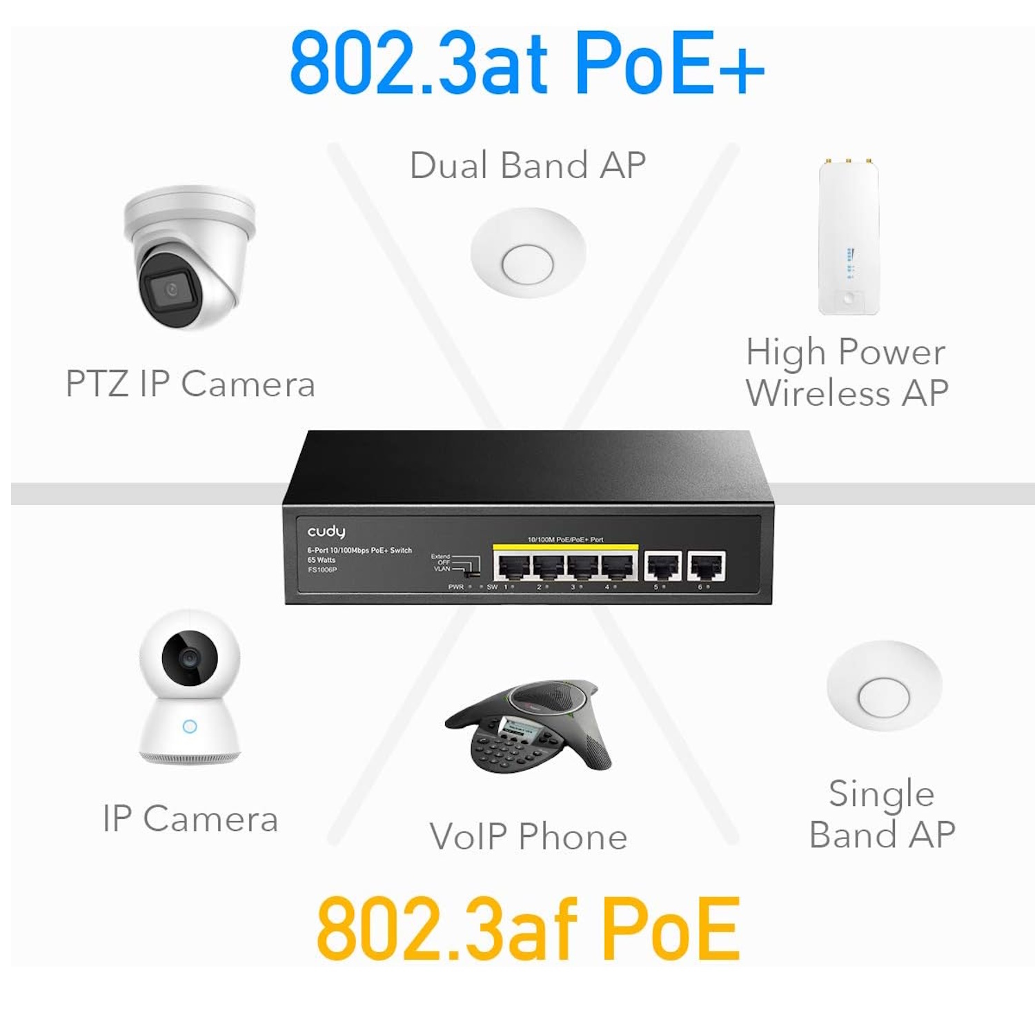 Cudy FS1006P NetPower ir izturīgs 6-portu Fast Ethernet PoE+ slēdzis, speciāli izstrādāts IP uzraudzībai, VoIP un mazo uzņēmumu tīklam. Ar 4 PoE+ portiem, kas atbalsta līdz 30W katram portam un kopējo PoE budžetu 65W, tas viegli nodrošina barošanu kamerām, bezvadu piekļuves punktiem un citām 802.3af/at ierīcēm. Slēdzis ietver CCTV režīmu, 250m tālās atbalsta iespējas un hardvara watchdog, kas automātiski restartē nereaģējošas PoE ierīces — nodrošinot nepārtrauktu uzticamību.