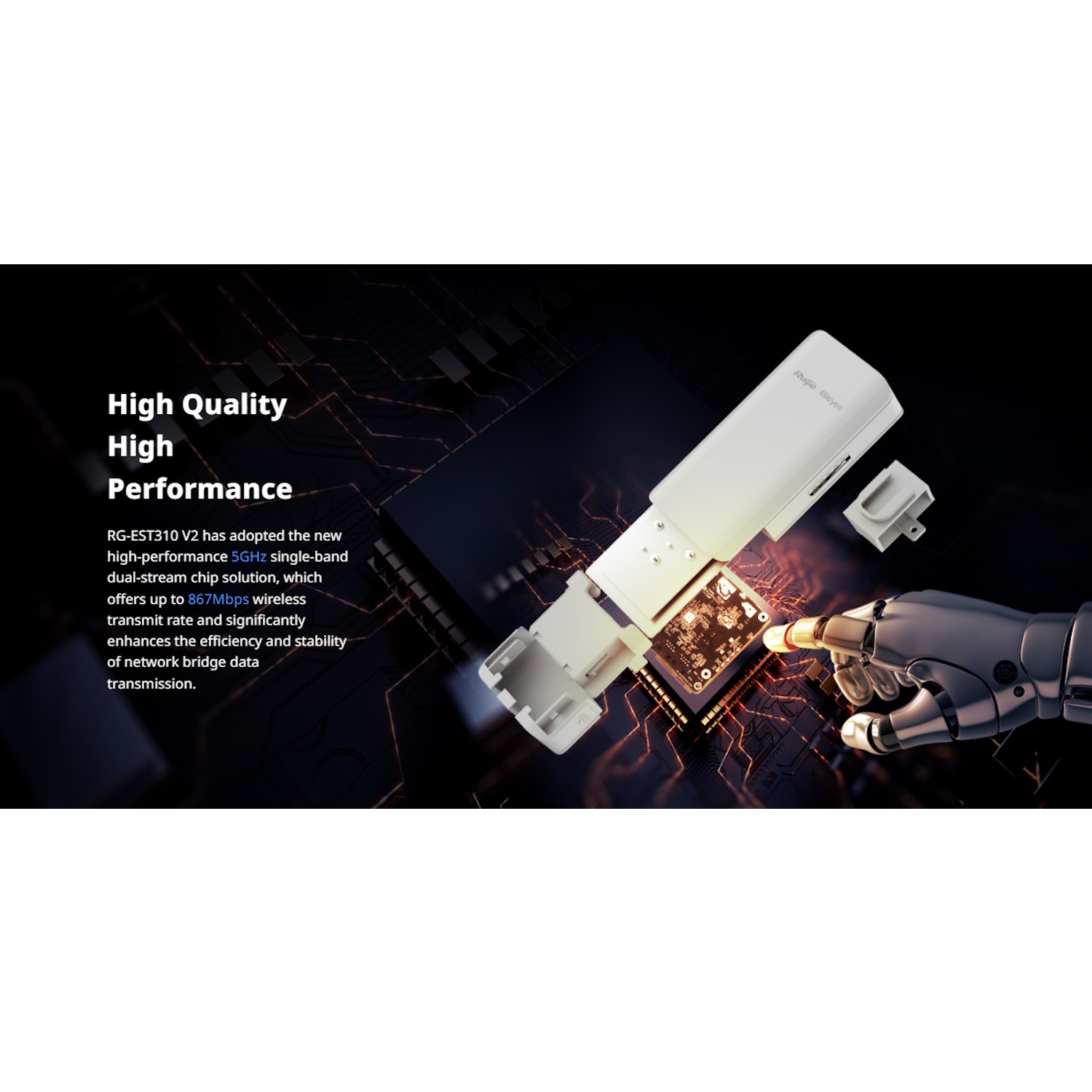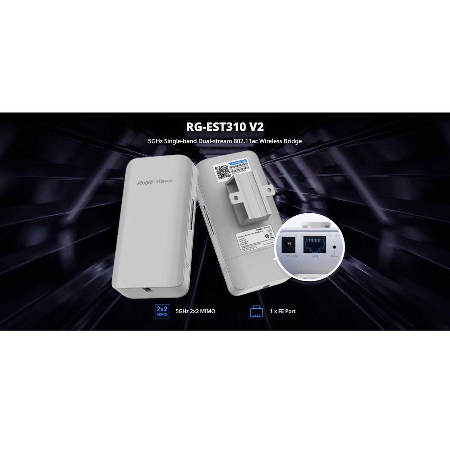 Ruijie RG-EST310 V2 ir izturīgs, augstas veiktspējas bezvadu tilts darbam 5GHz joslā un paredzēts ilgstošām punktu-punktu lietojumprogrammām līdz 1 km. Izstrādāts uzraudzībai, lauku interneta paplašināšanai vai universitātes ēku savienojumam, tas piedāvā duālā plūsma 802.11ac (Wi-Fi 5) tehnoloģiju, integrētas 10 dBi virziena antenas un iepriekš savienotu plug-and-play funkcionalitāti.