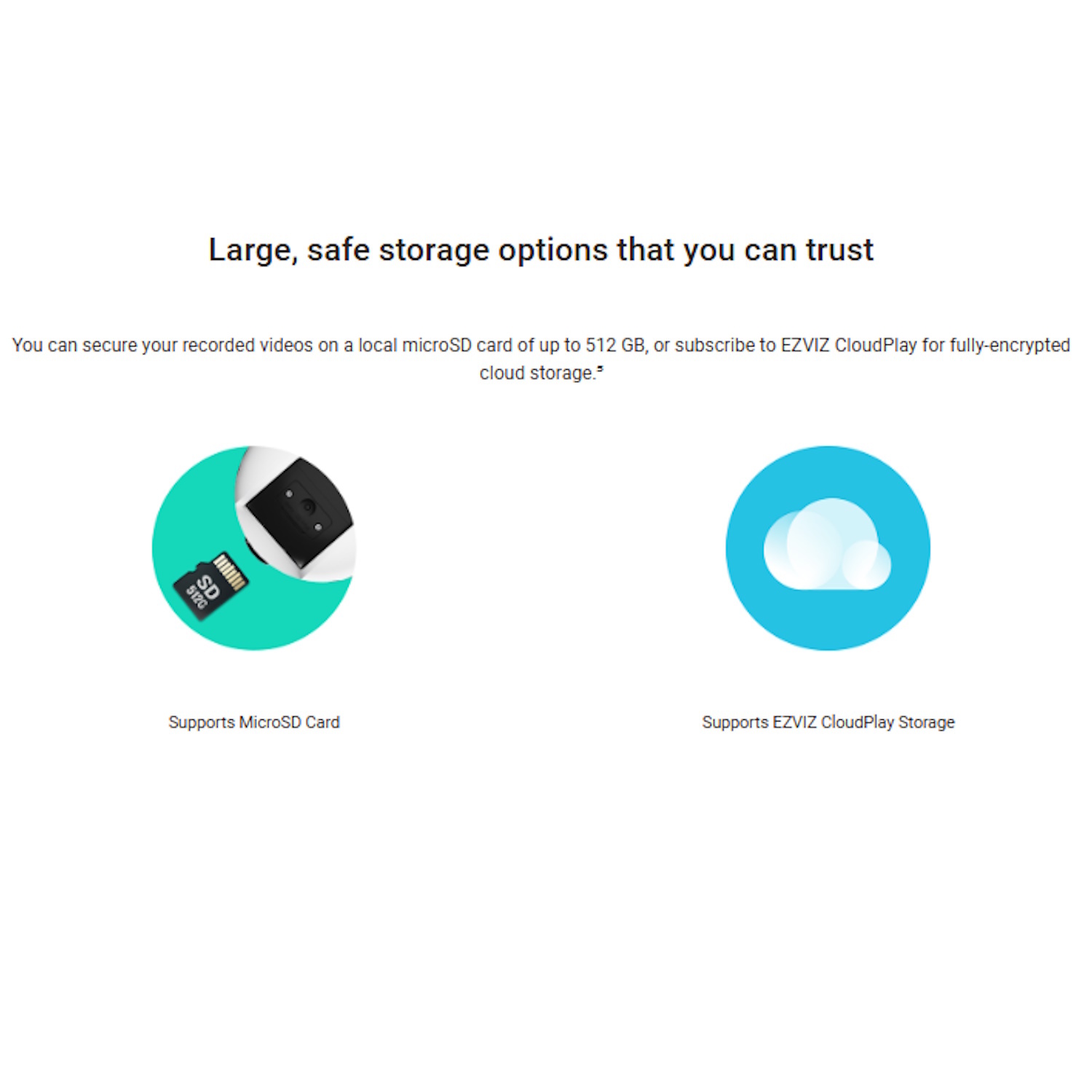Kamera atbalsta MicroSD kartes līdz 512GB vietējai uzglabāšanai un piedāvā opcijas EZVIZ CloudPlay pakalpojumus drošai mākoņu uzglabāšanai.