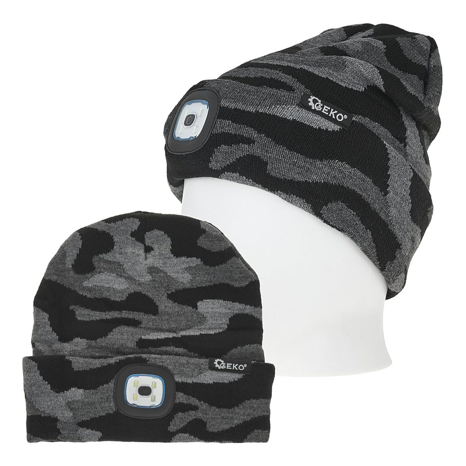 GEKO G90411 ir silta ziemas adīta cepure ar integrētu LED lukturīti un USB uzlādi. Camo dizains nodrošina atšķirīgu izskatu, bet iebūvētais apgaismojums rūpējas par redzamību tumsā. Lukturītis ir noņemams, uzlādējams tieši caur USB un nodrošina līdz 150 lm spilgtumu līdz 4 stundām.